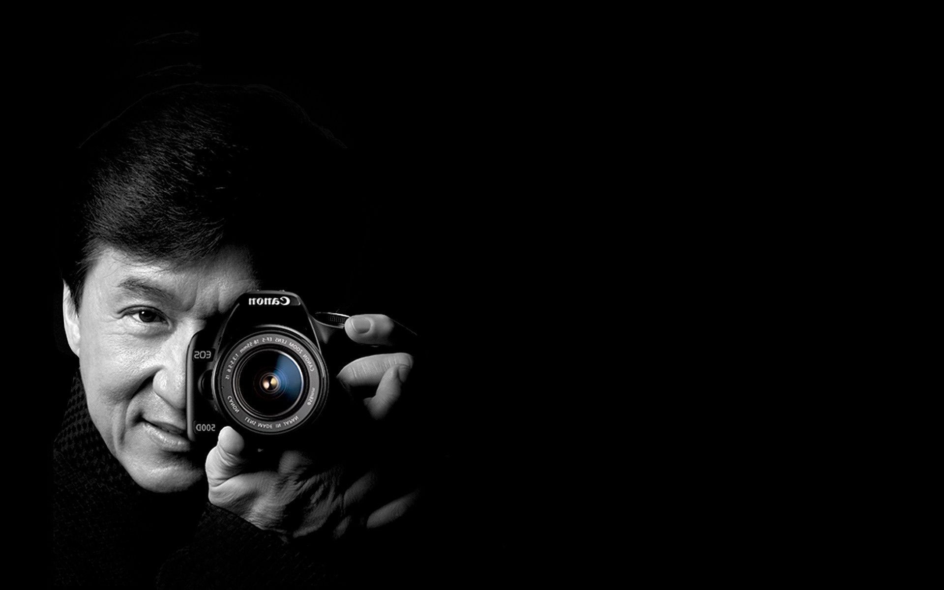 Attore con macchina fotografica su sfondo nero