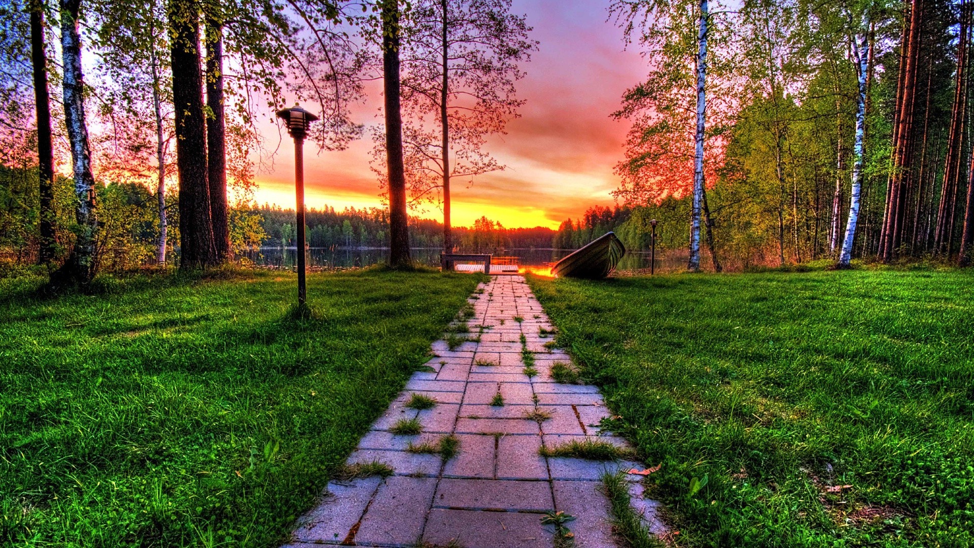 Tramonto sul lago nel parco. Sentiero e Lanterna