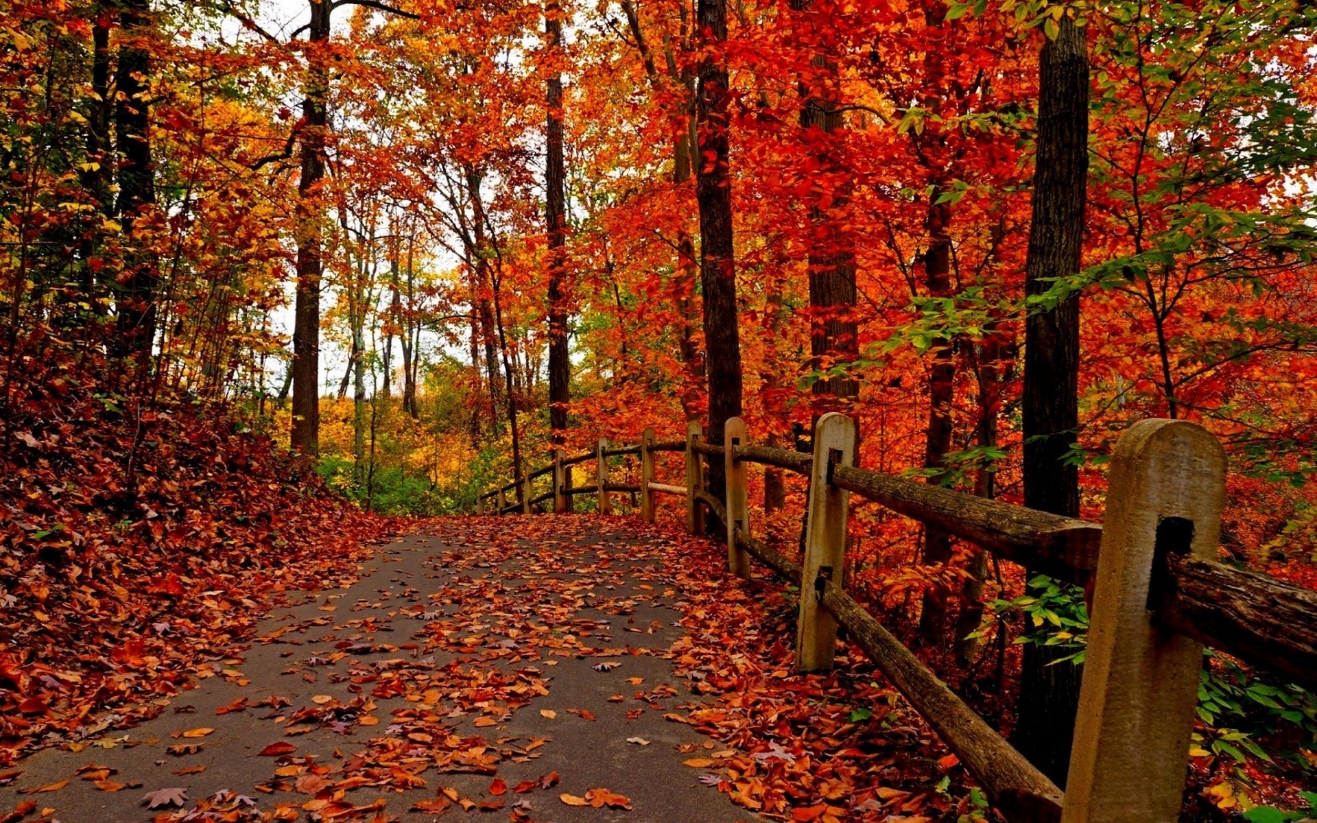 Strada con recinzione nella foresta rossa e gialla autunnale