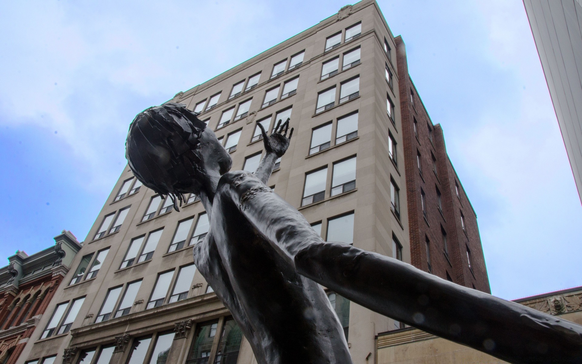 Scultura di un uomo sullo sfondo di un grattacielo