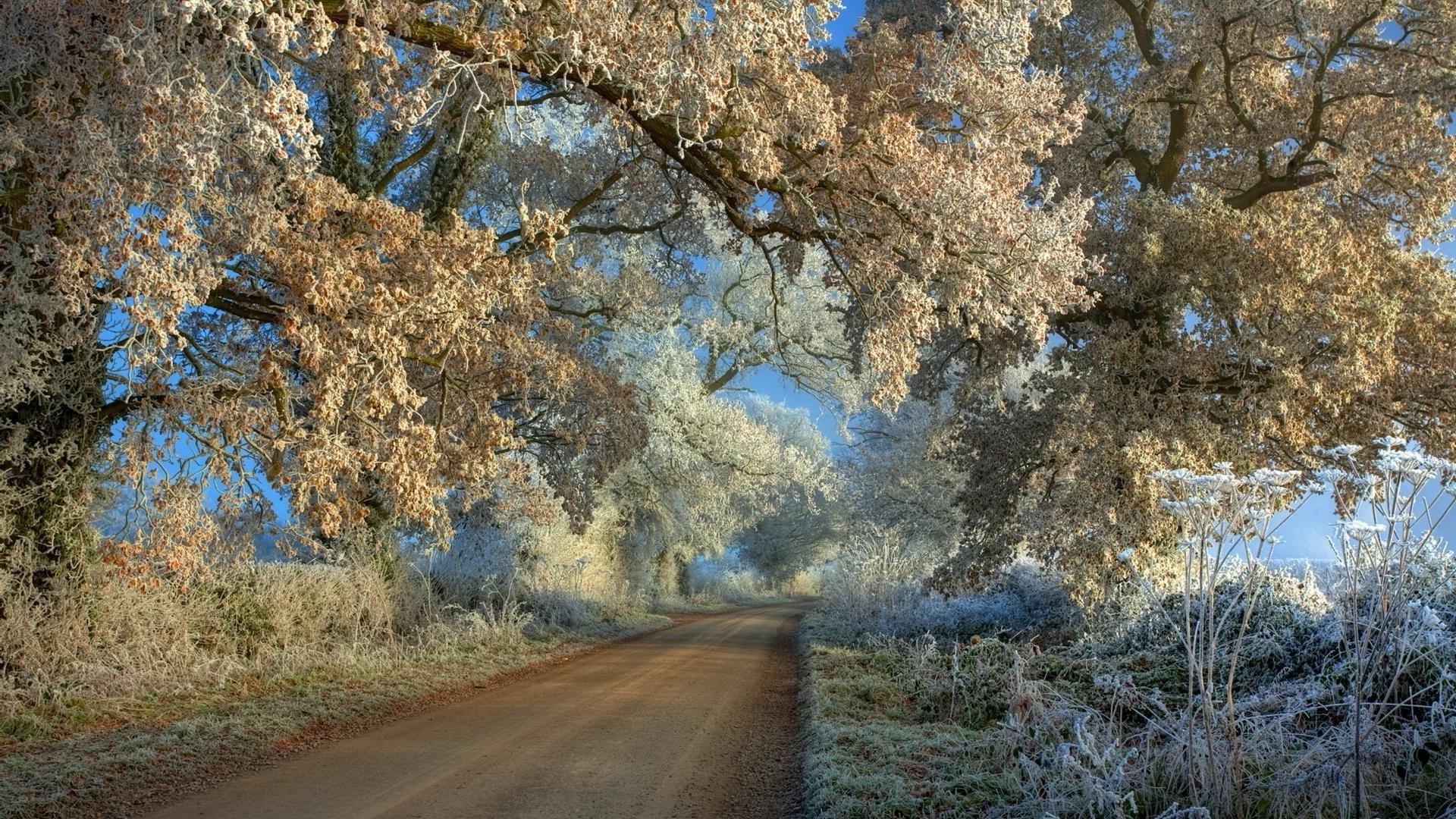 Prima neve sulle foglie degli alberi che pendono sulla strada