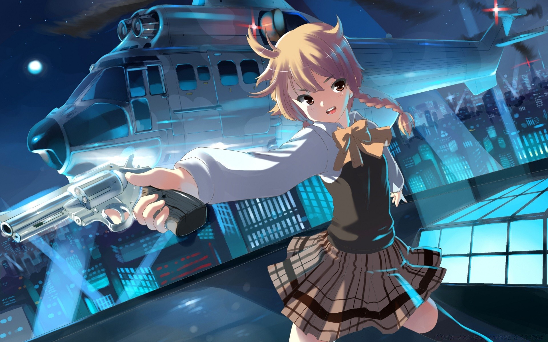 Ragazza con una pistola con un elicottero dietro la schiena