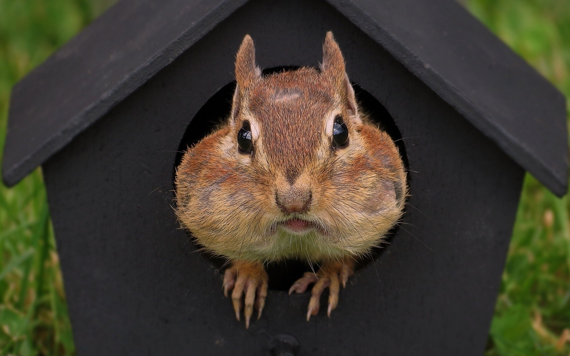 Roditore dai Capelli rossi che sporge dalla casetta per gli uccelli