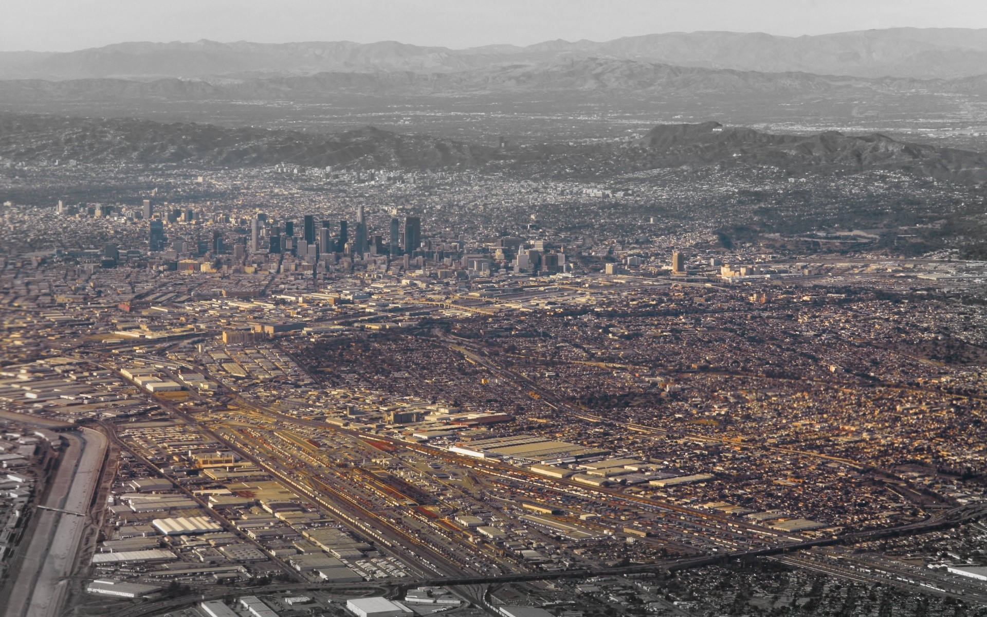 Tetti rossi delle case dall'alto nella pianura alluvionale del fiume