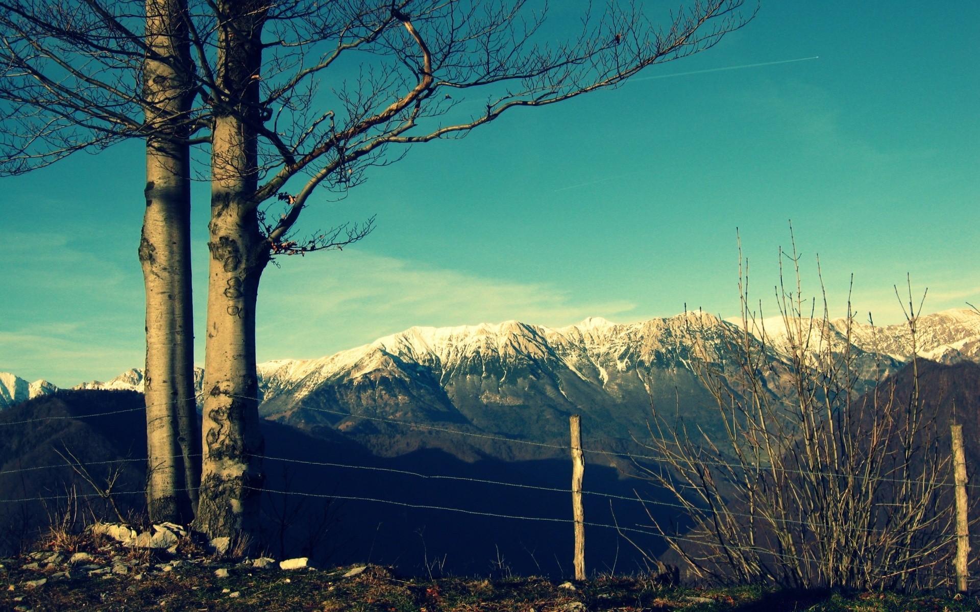 Paesaggio di terreno montuoso con cielo cupo e arcobaleno