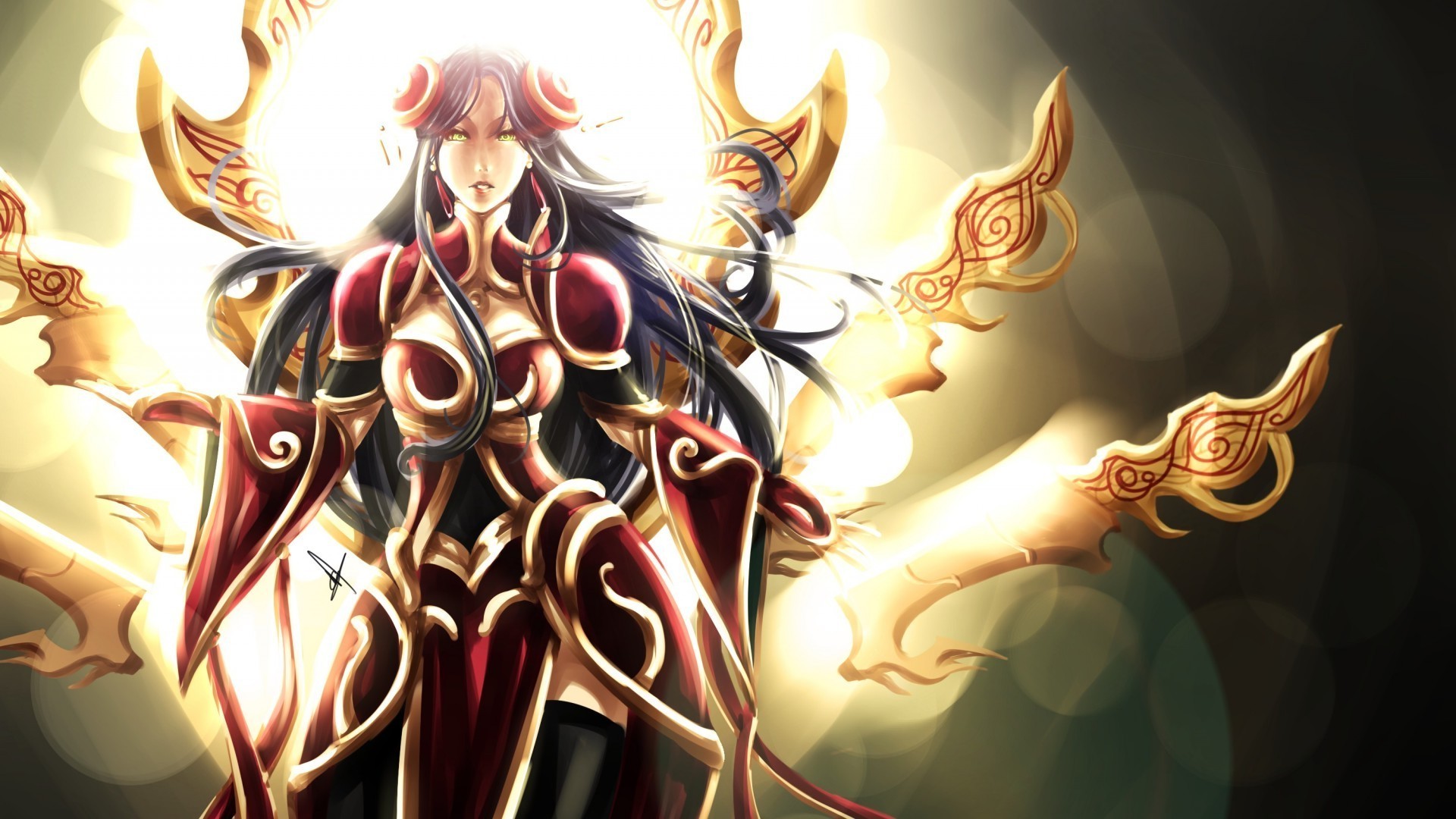 Ragazza in abito rosso e oro su uno sfondo di luce