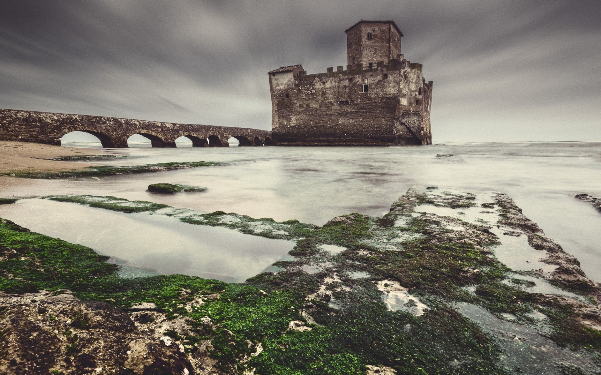 Castello con torre in piedi sulla cima di una roccia sotto il cielo notturno con la luna e le cometeCastello con torre in piedi sulla cima di una roccia sotto il cielo notturno con la luna e le comete