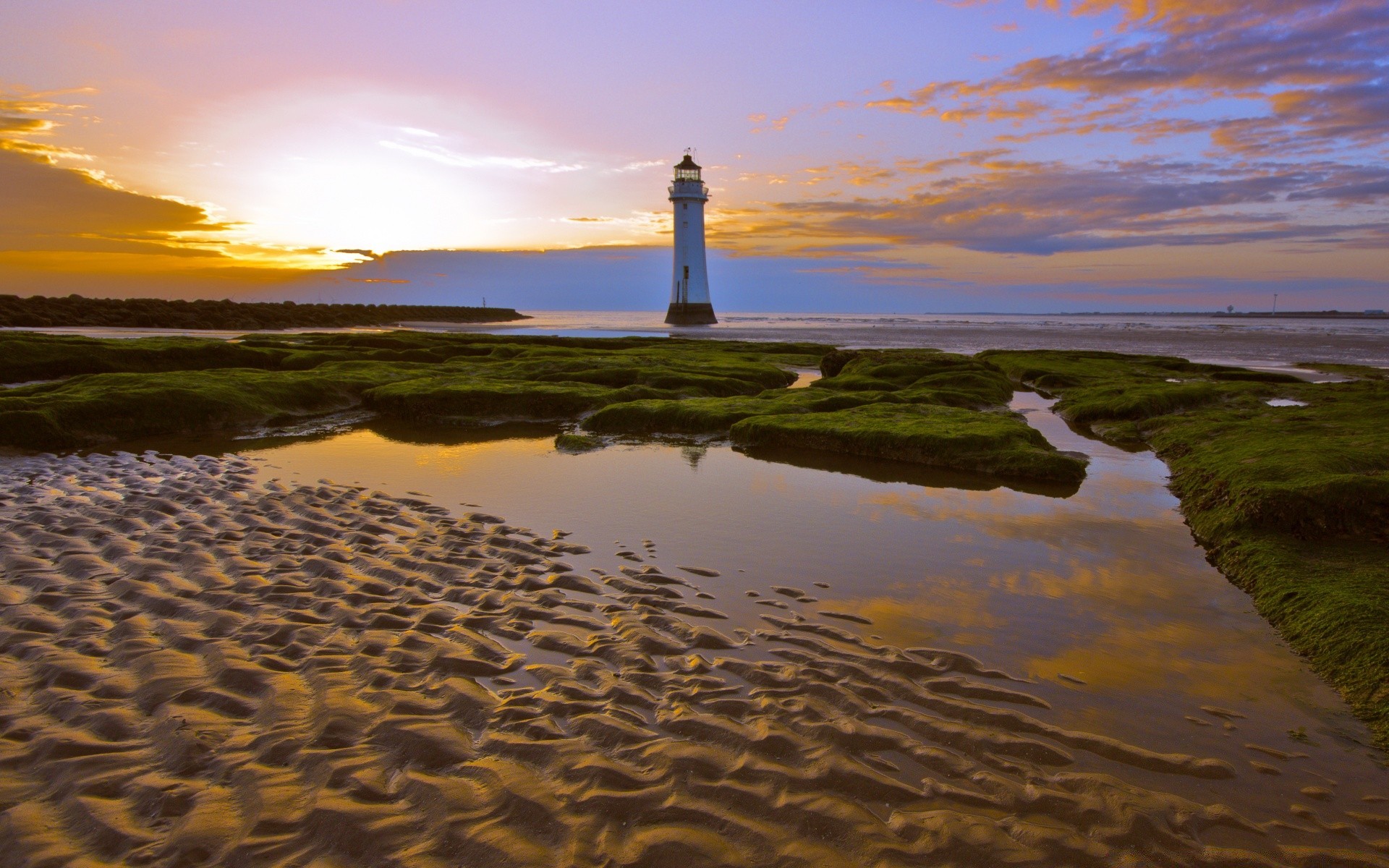 Faro solitario circondato da acqua e vegetazione verde al tramonto