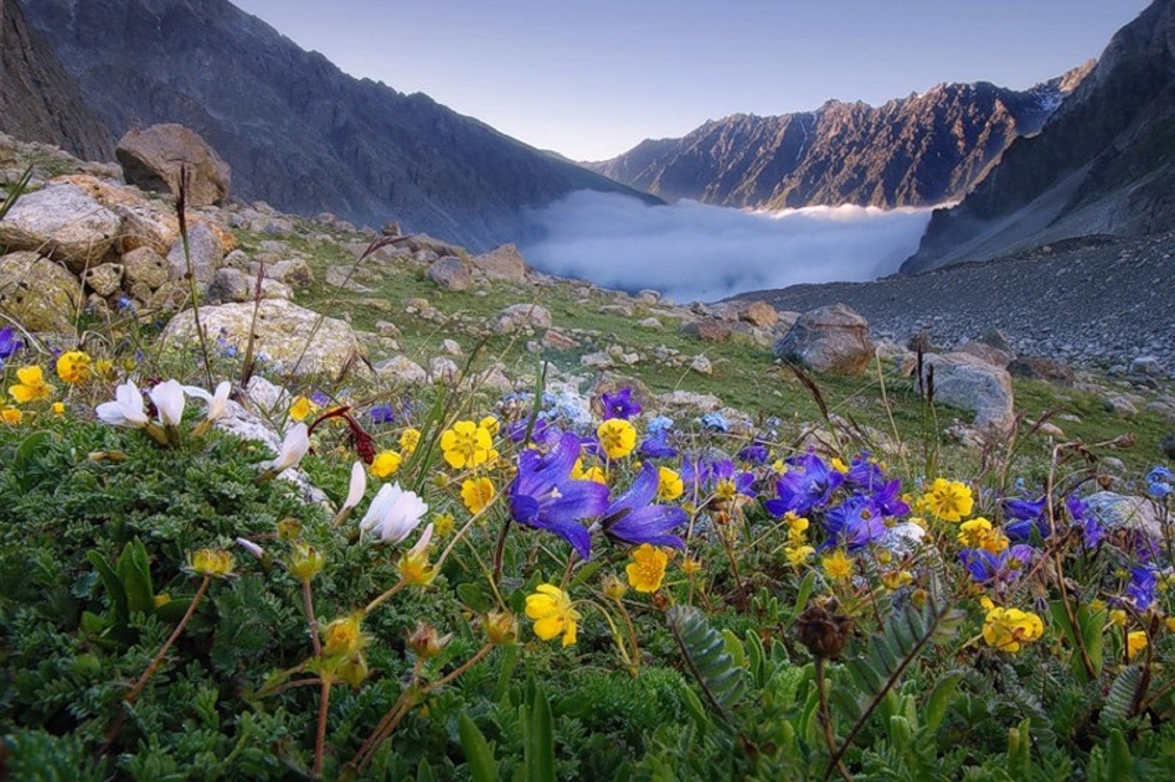 Fiori gialli viola accanto alle pietre ai piedi della montagna su uno sfondo di nessuna nuvola nebbiosa