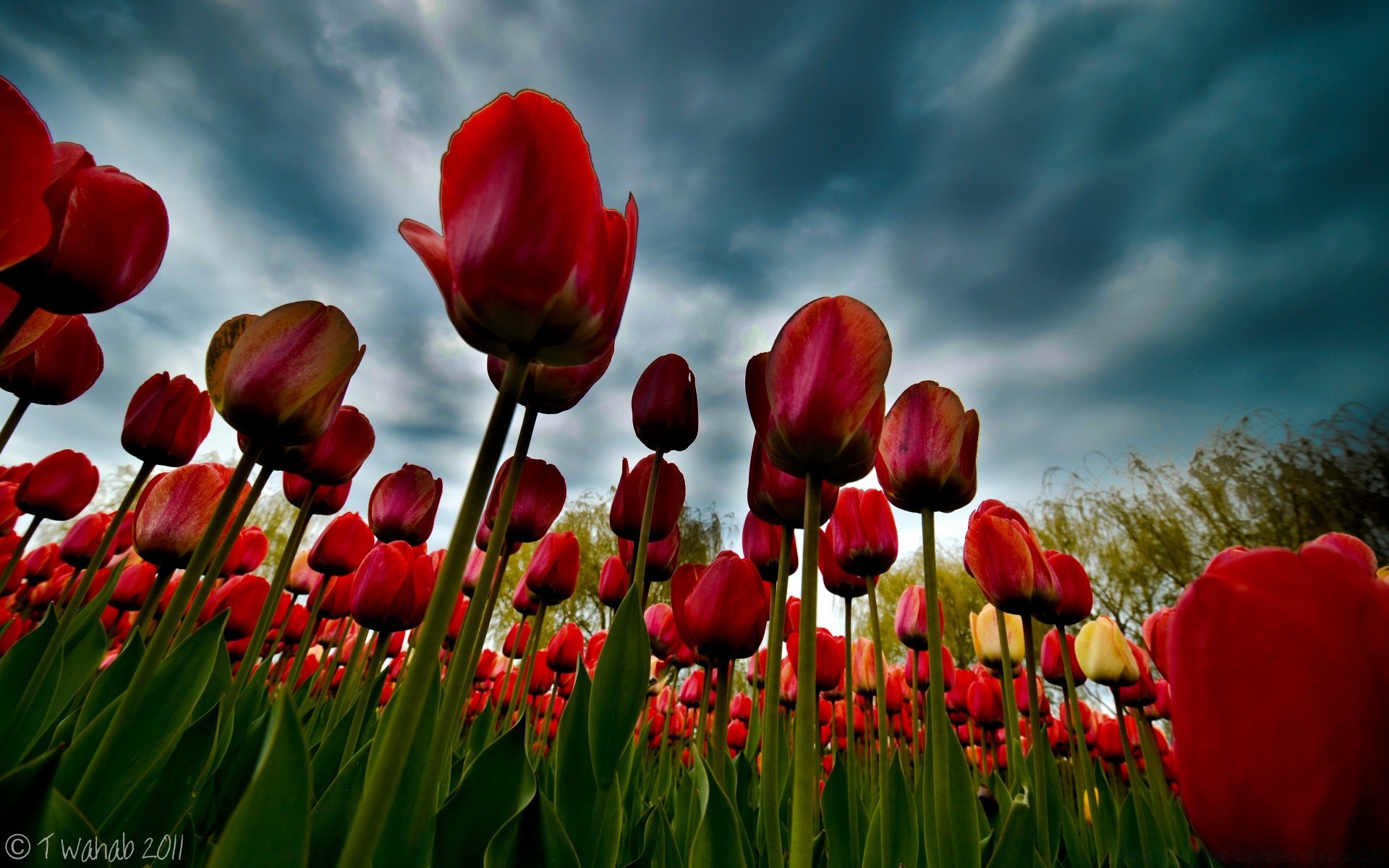 Campo di tulipani vista dal basso. Cielo