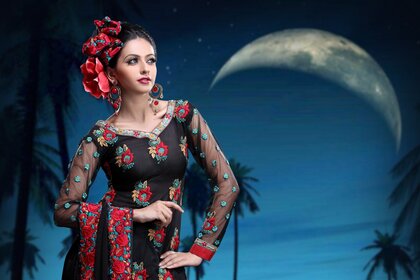 Ragazza in abito nero con fiori rossi ina sfondo enorme luna