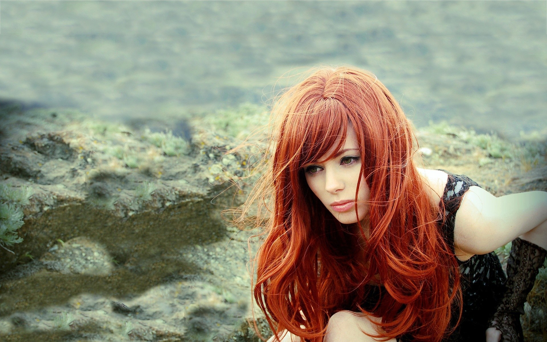Bella ragazza con i capelli rossi folti vicino all acqua