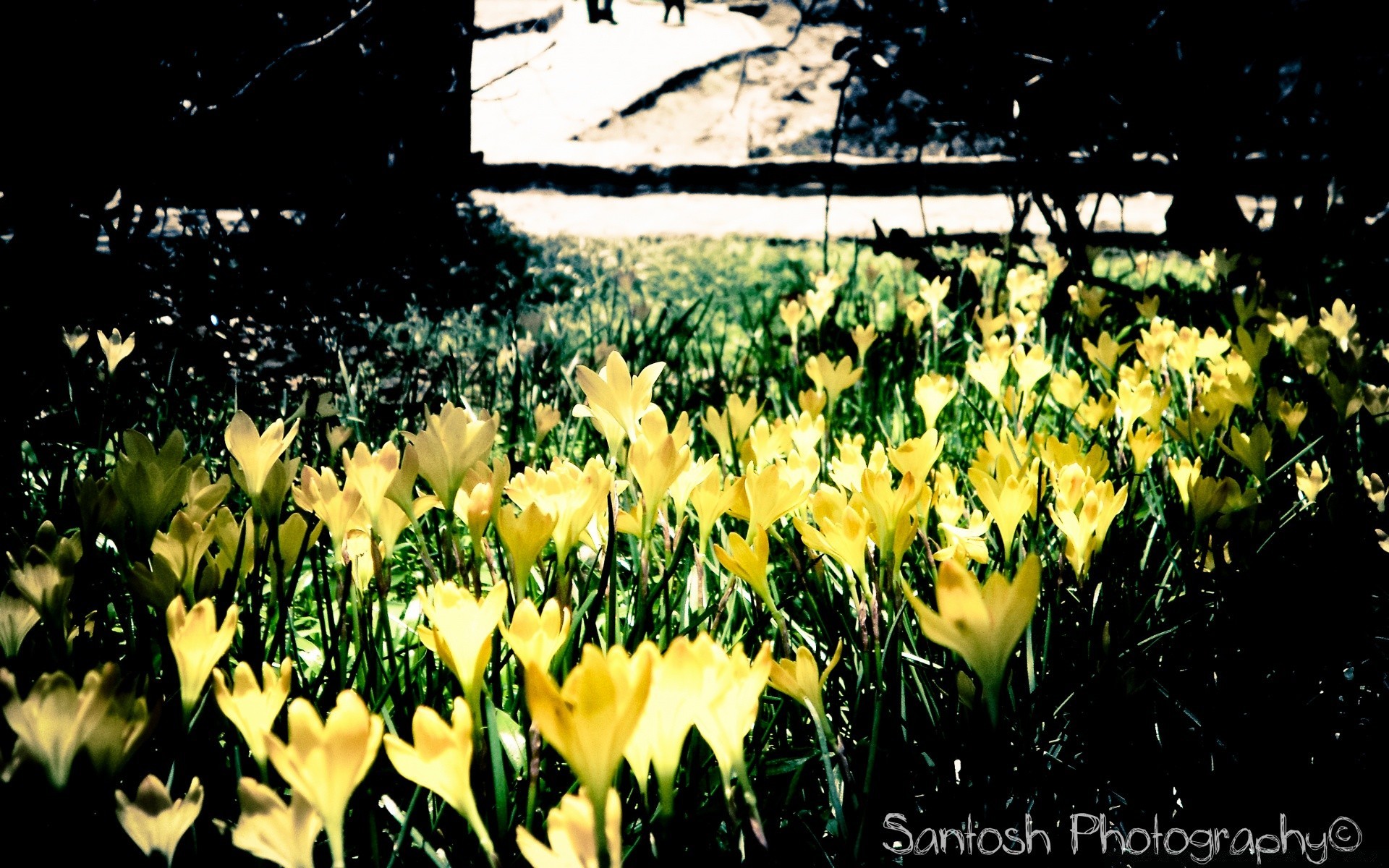 Radura illuminata dal sole con le primule gialle