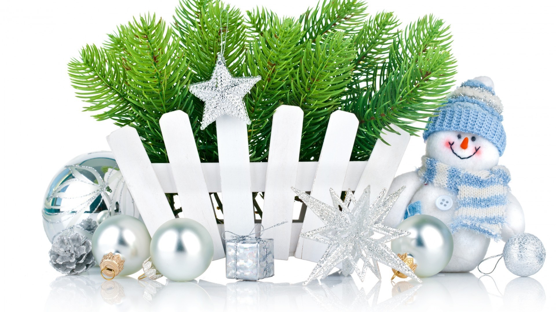 Rami di abete rosso, pupazzo di neve e altre decorazioni natalizie