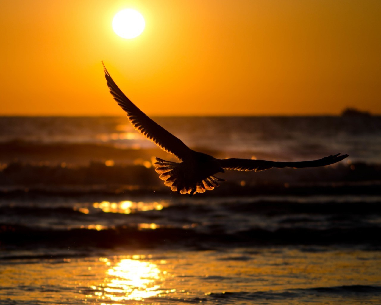 Gabbiano al tramonto in cerca di cibo nell oceano