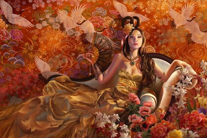 Ragazza in abito di seta dorata e con un ventaglio in mano, sdraiata su un divano su uno sfondo di carta da parati con gru e fiori giapponesiRagazza in abito di seta dorata e con un ventaglio in mano, sdraiata su un divano su uno sfondo di carta da parati con gru e fiori giapponesi