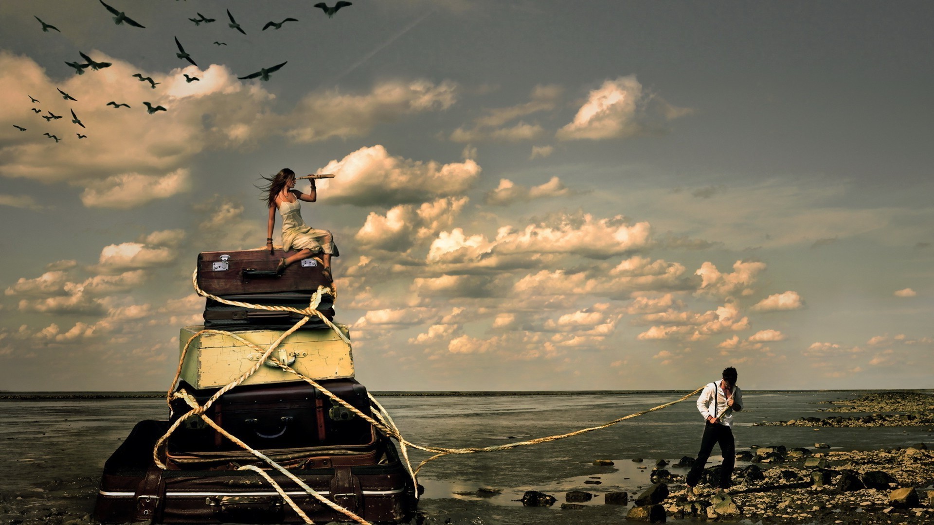 L'uomo tira le valigie di una bella ragazza sulla spiaggia come un burlac
