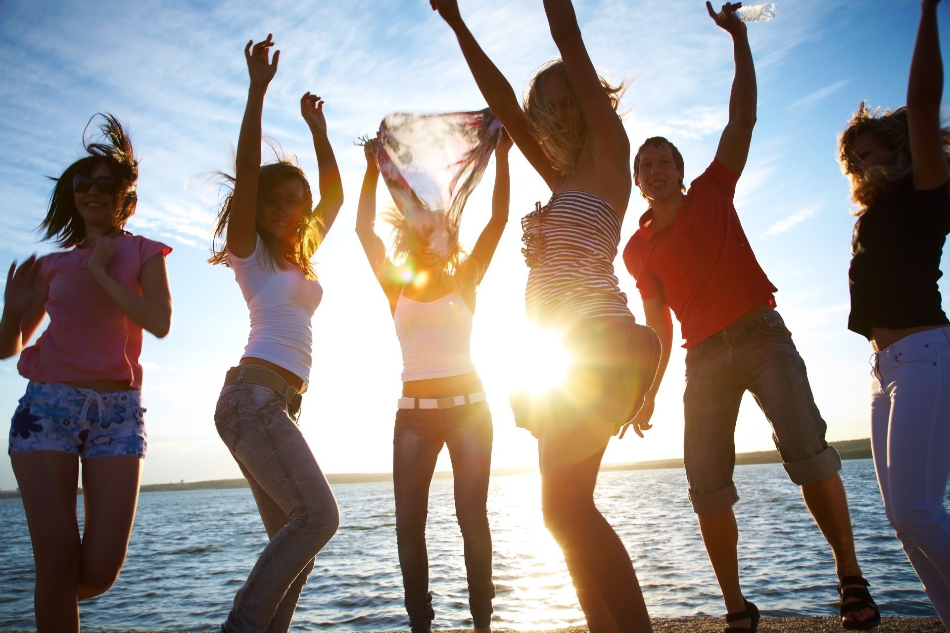 La festa degli amici si svolge in riva al lago con i raggi luminosi del sole