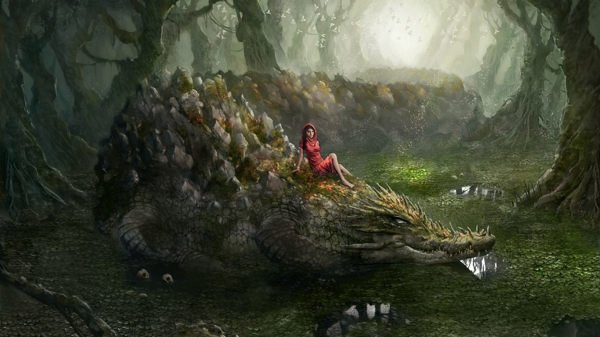 Il coccodrillo magico porta la ragazza attraverso la foresta magica