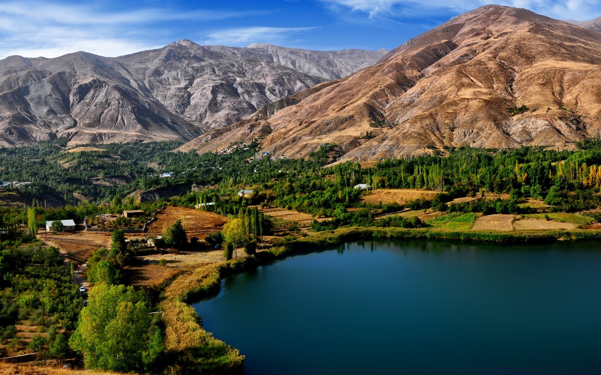Tetti rossi delle case dall'alto nella pianura alluvionale del fiume