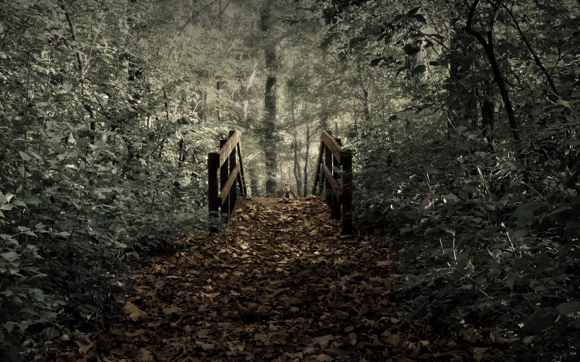 Vecchio ponte di legno nel bosco invaso