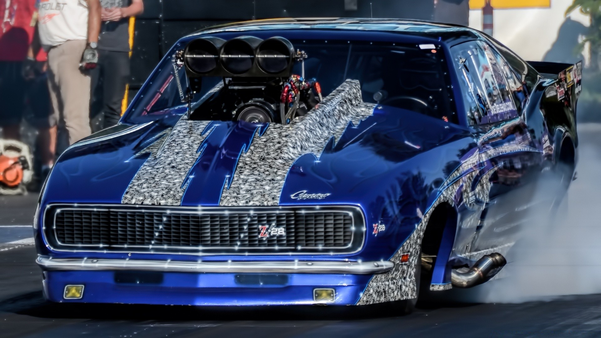 L'auto si trova sullo sfondo di montagne e campi verdi
