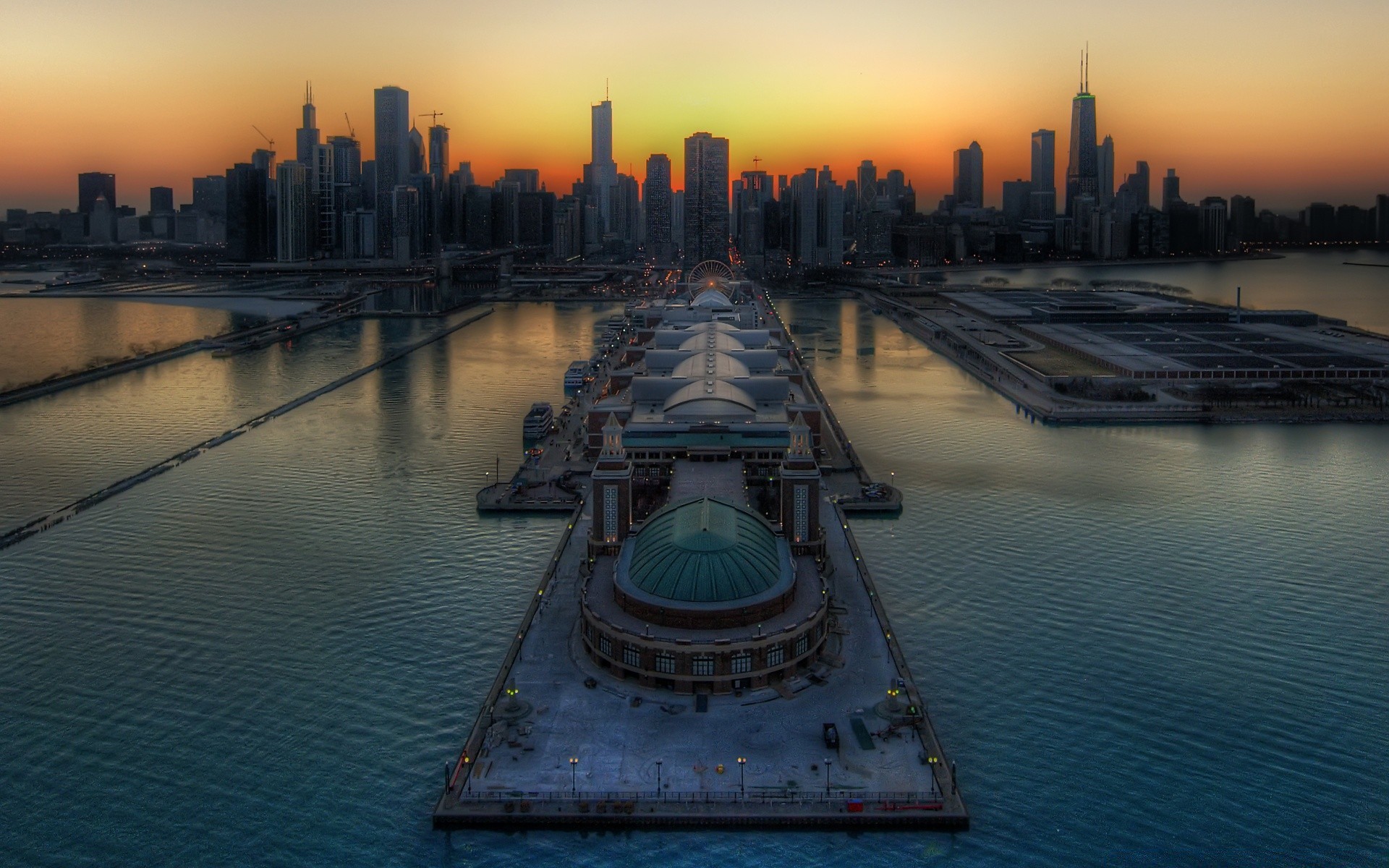 Bella città al tramonto da una vista a Volo d'uccello
