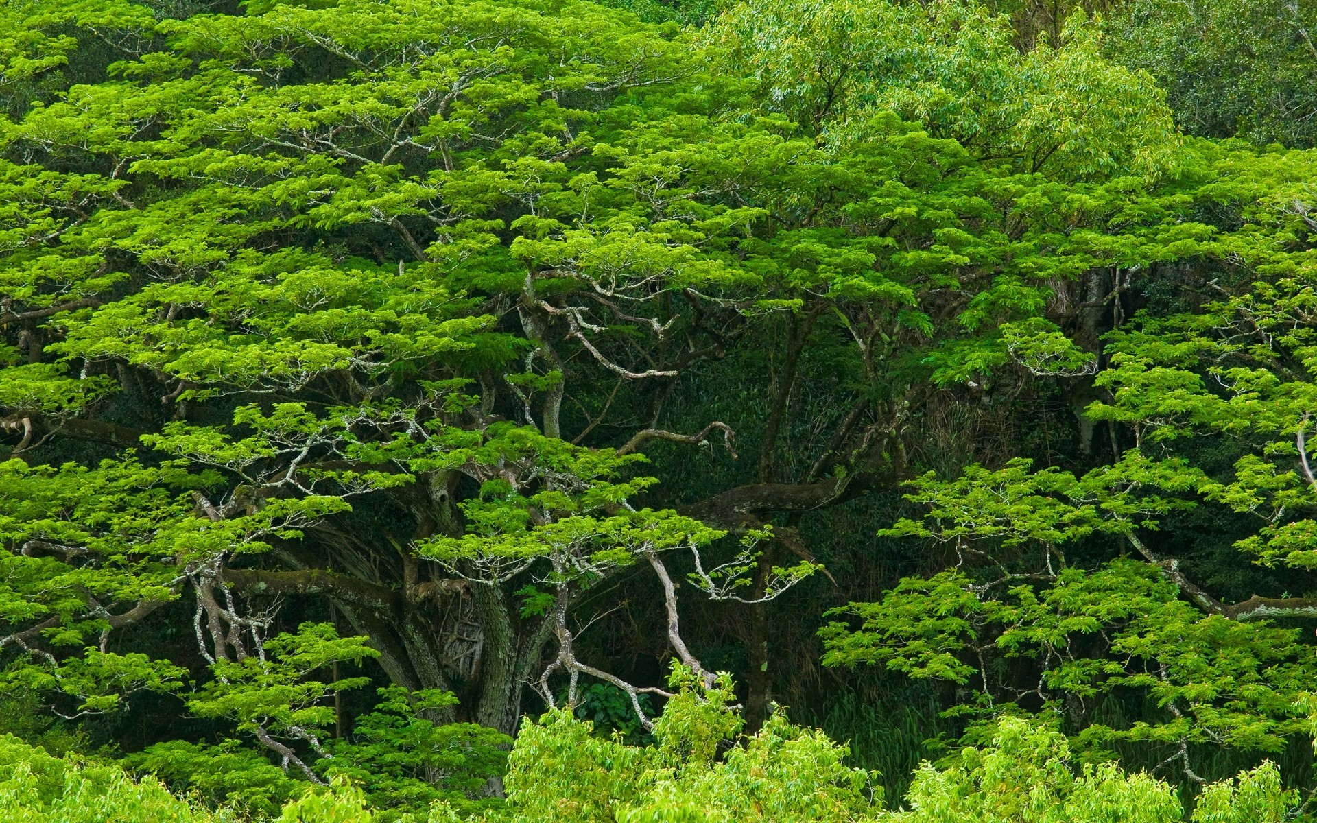 Alberi tropicali verde brillante inondati di sole