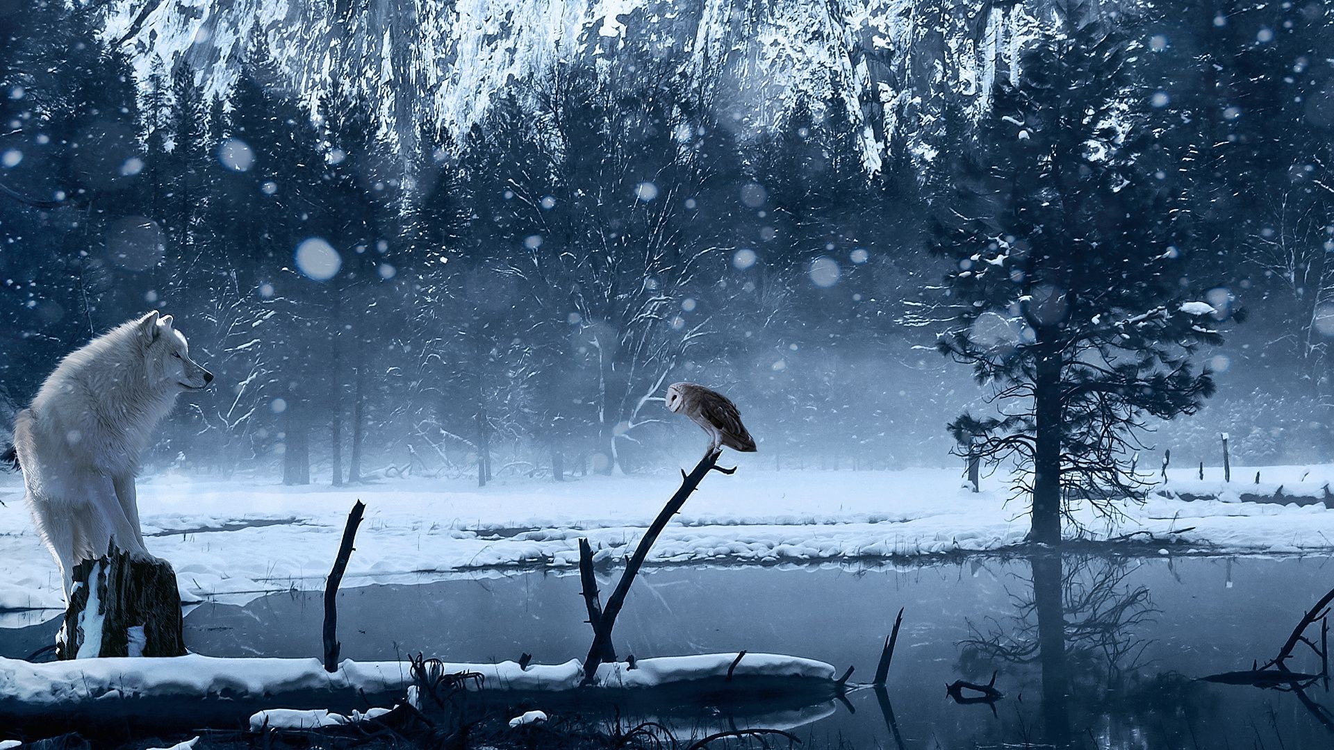Lupo e gufo si guardano l'un l'altro vicino al lago