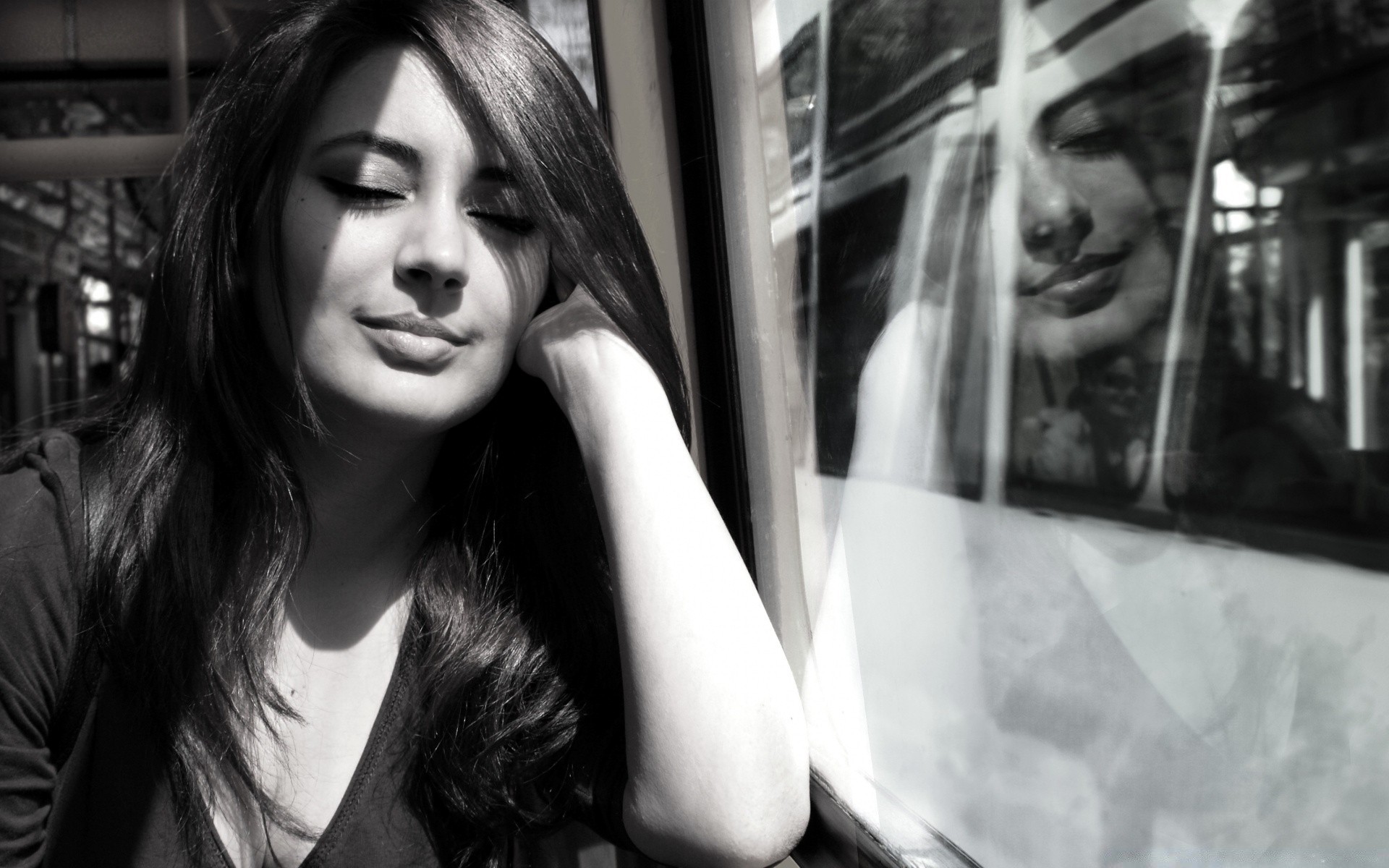 Ragazza con i capelli lunghi si siede vicino alla finestra