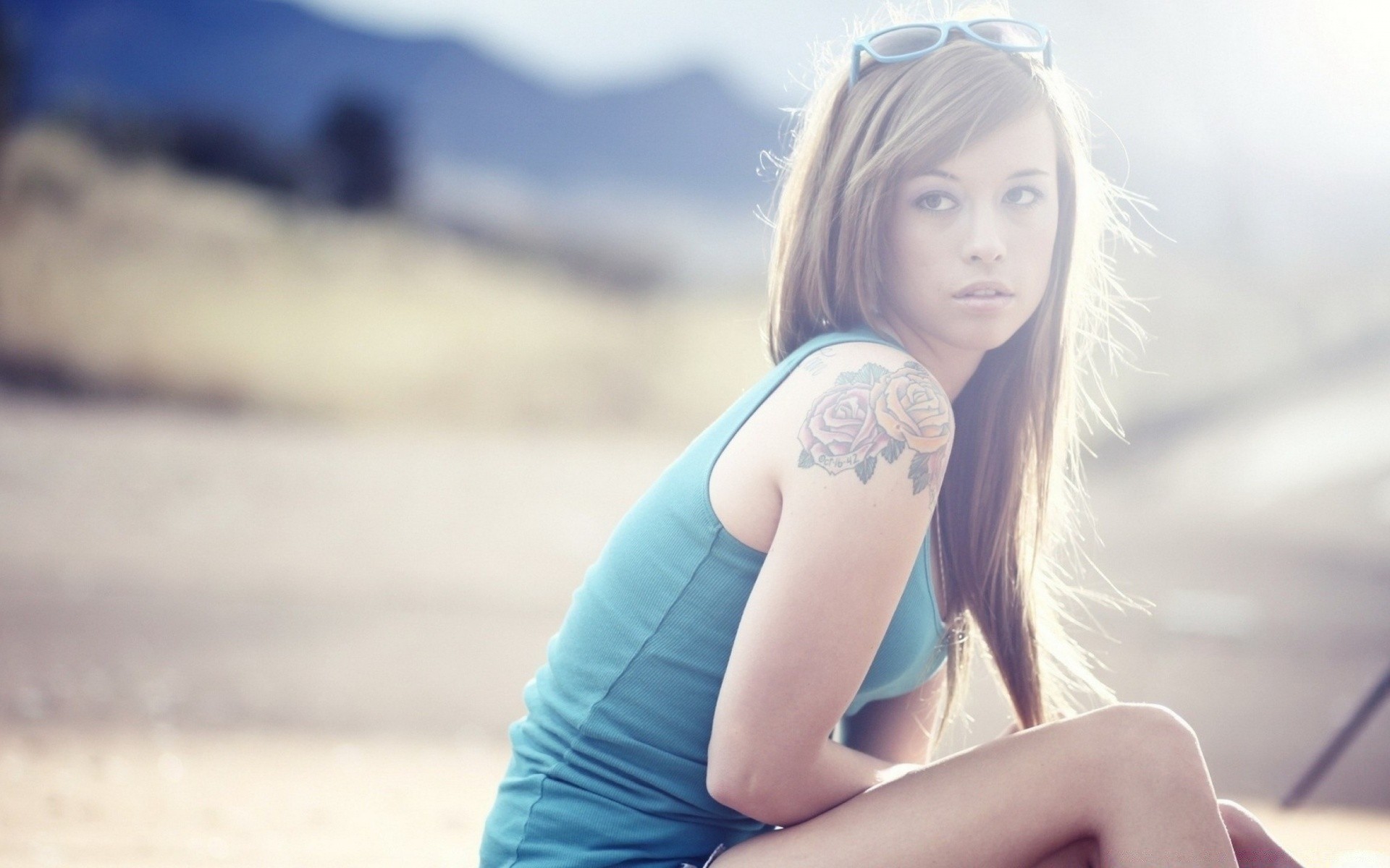Ragazza in cima blu seduta sulla spiaggia