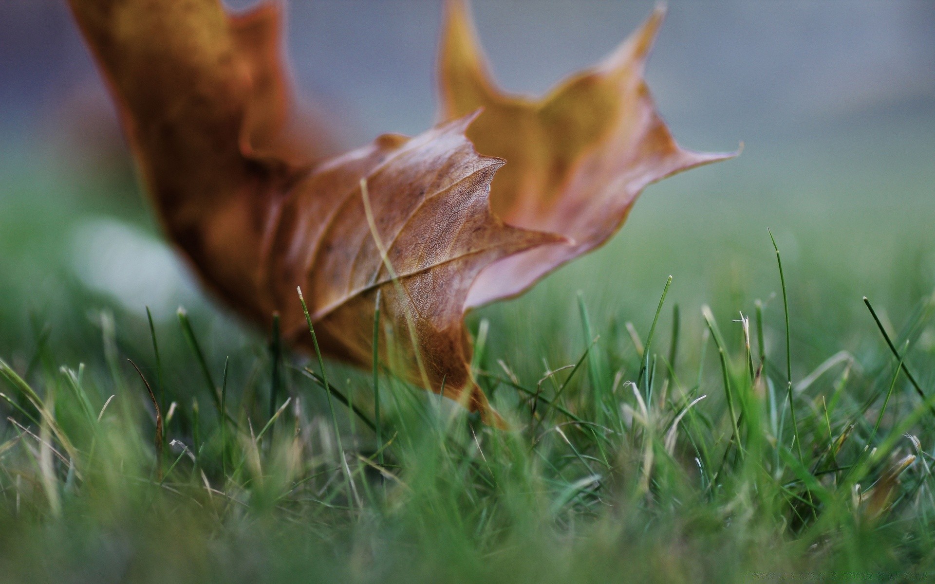 Foglia solitaria caduta sull'erba verde. Vita e morte