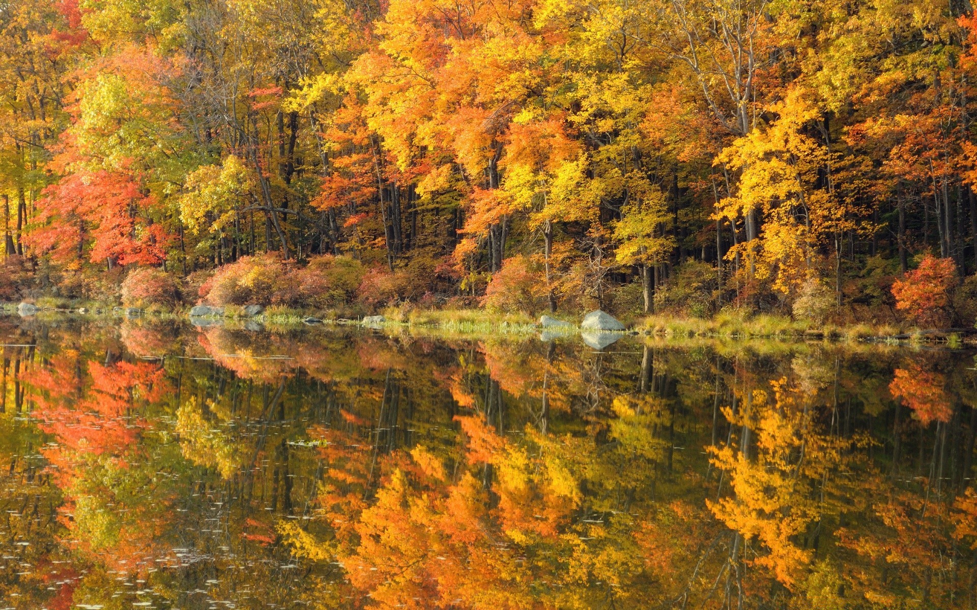 Alberi autunnali sullo sfondo della superficie liscia del fiume