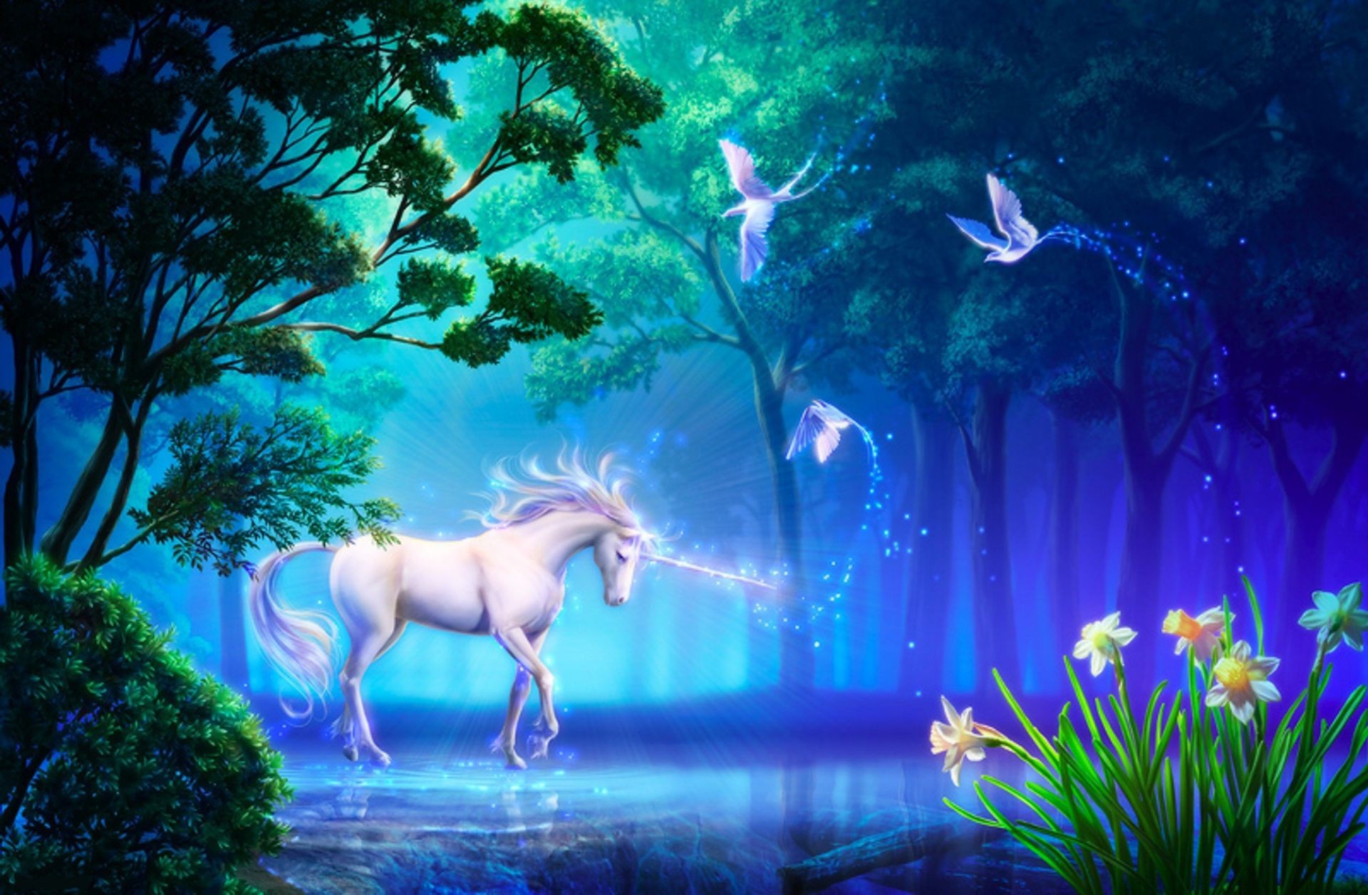 Arte uccelli fiori lago foresta takaki cavallo unicorno