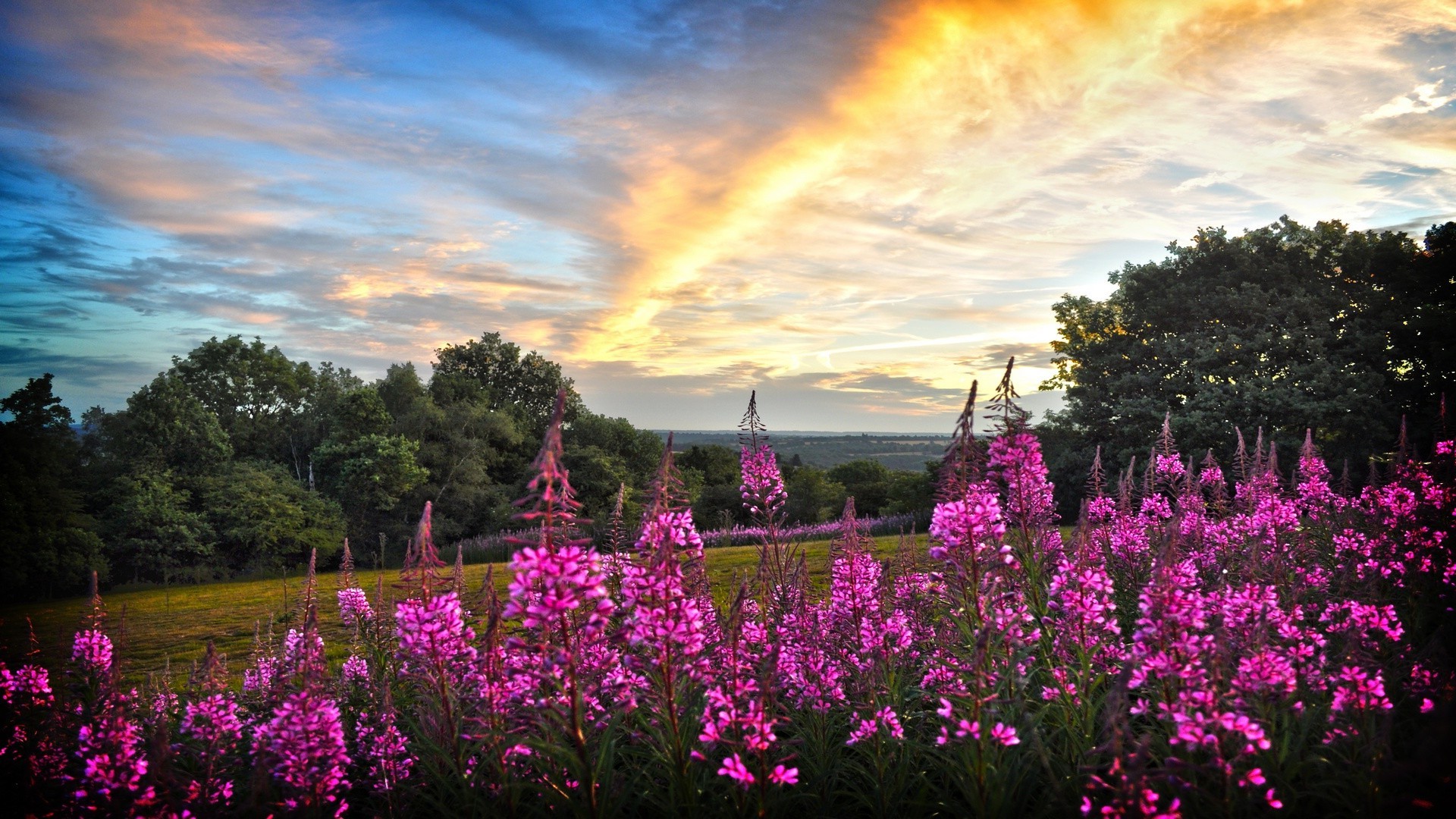 Fiori rosa in un campo al tramonto