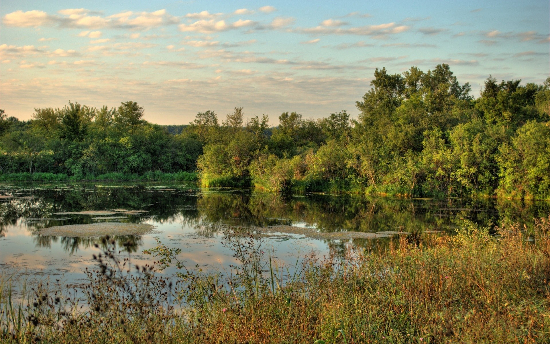 Alberi in abito autunnale che si riflettono nella superficie del lago con tempo chiaro e calmo