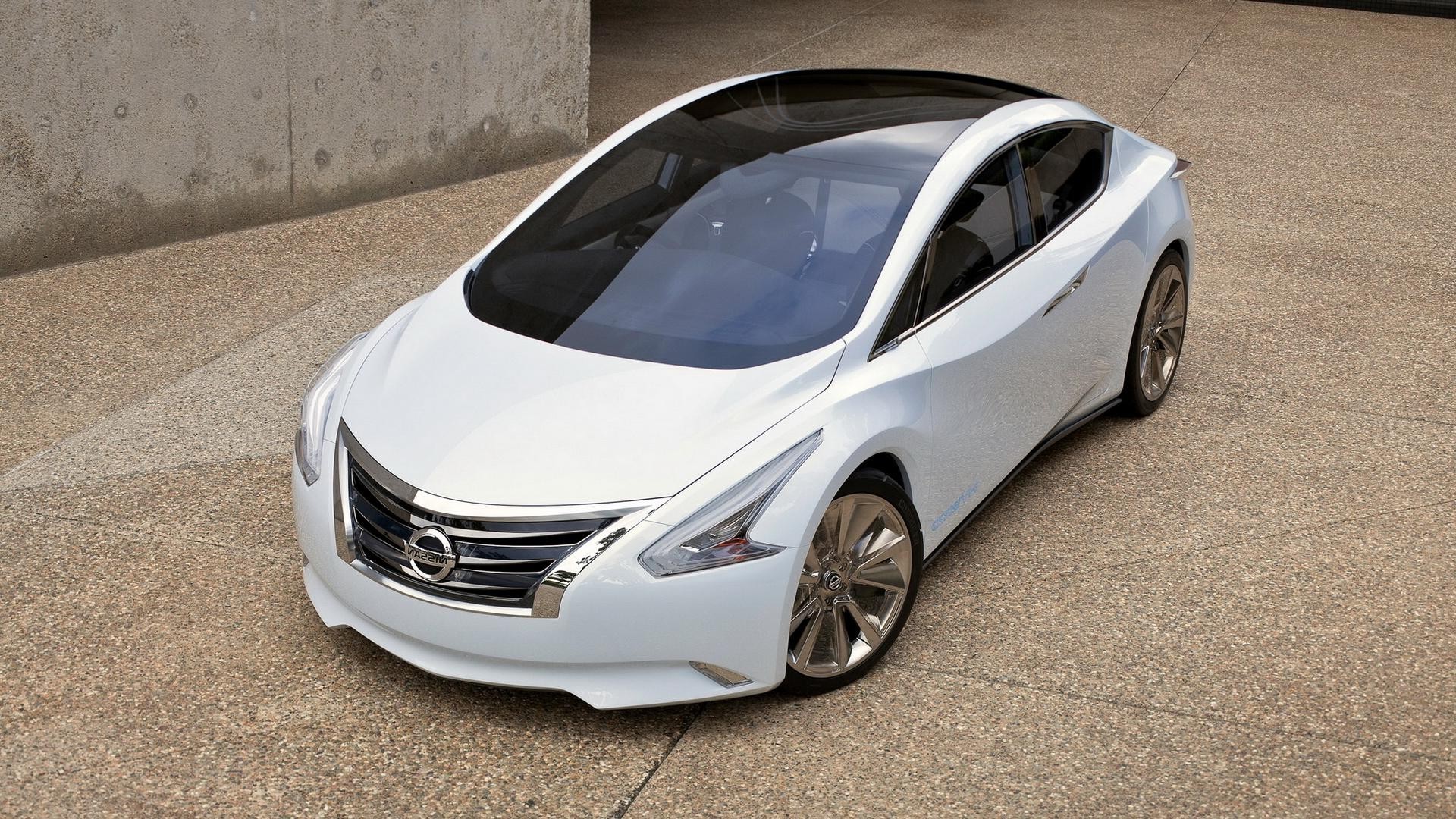 Nissan bianca sulla strada accanto alla lastra di cemento