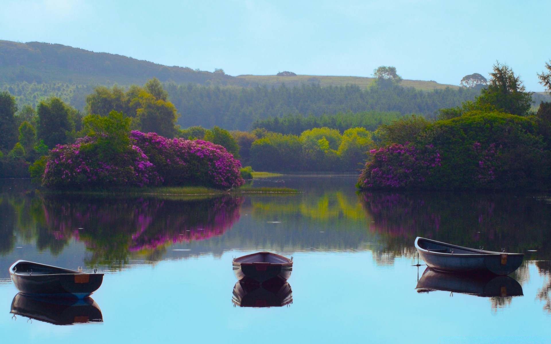 Tre barche su una superficie piana dell'acqua