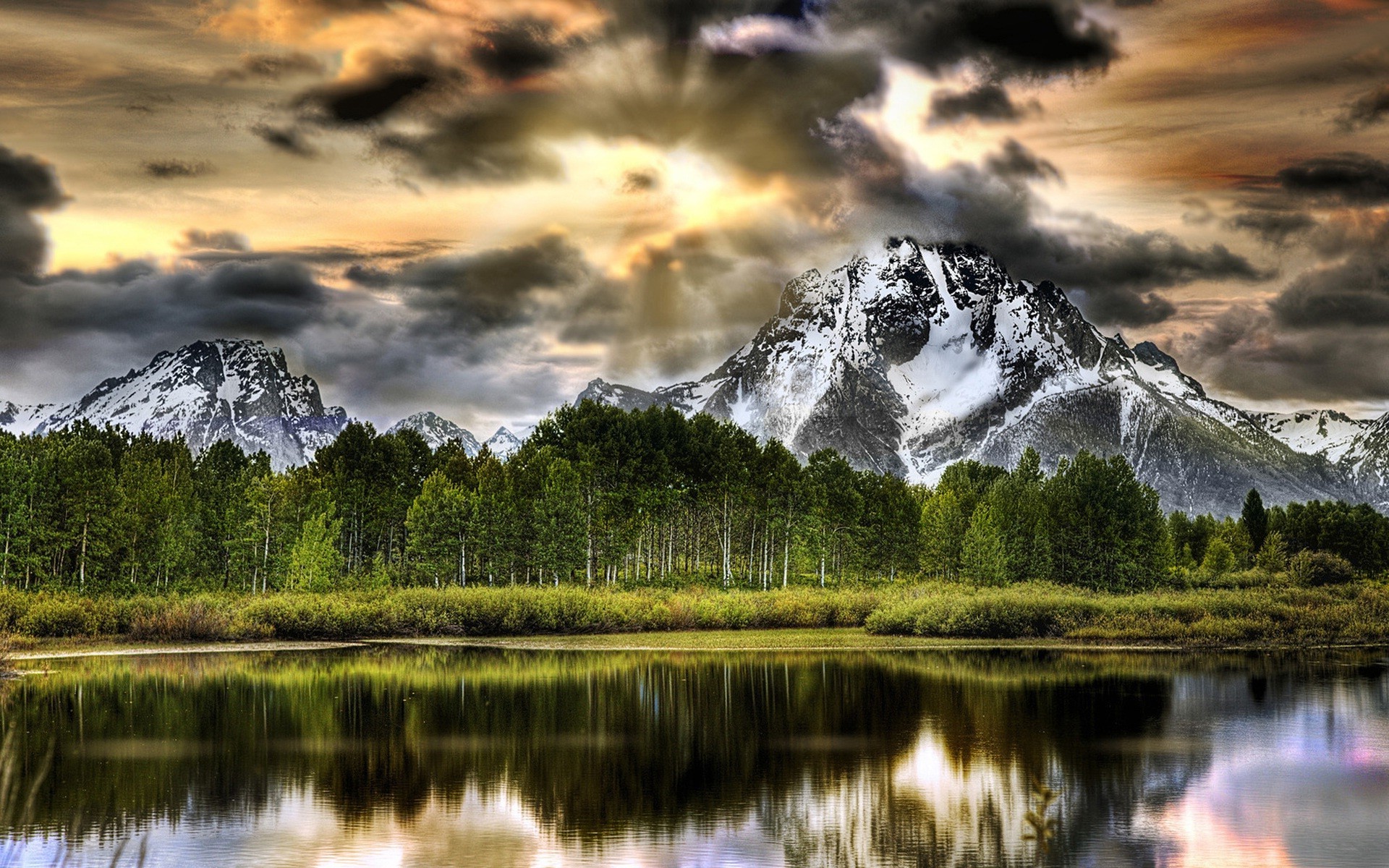 Paesaggio fluviale. Montagna. Alberi. Riflessione della flora nell'acqua