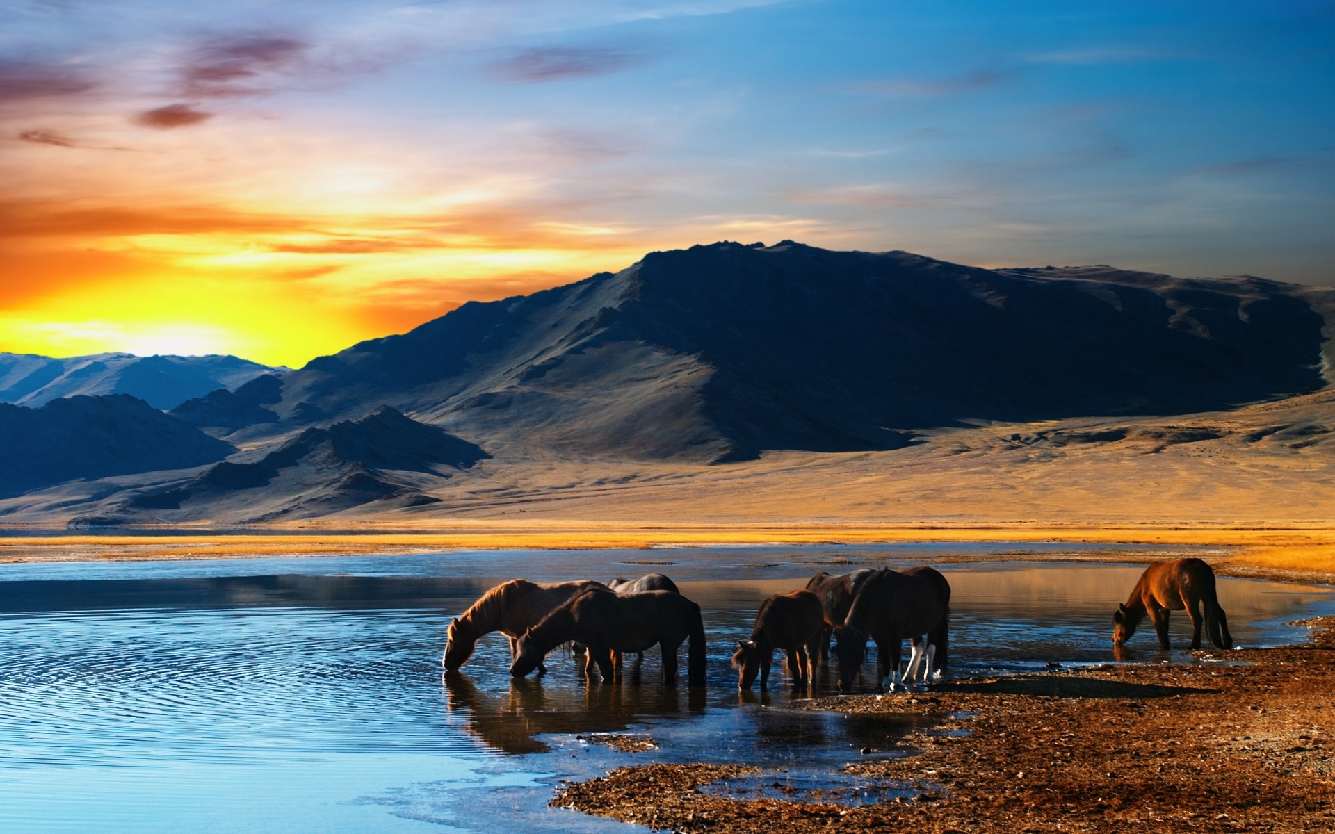 I cavalli in riva al lago sono venuti abbeveratoioI cavalli in riva al lago sono venuti abbeveratoio