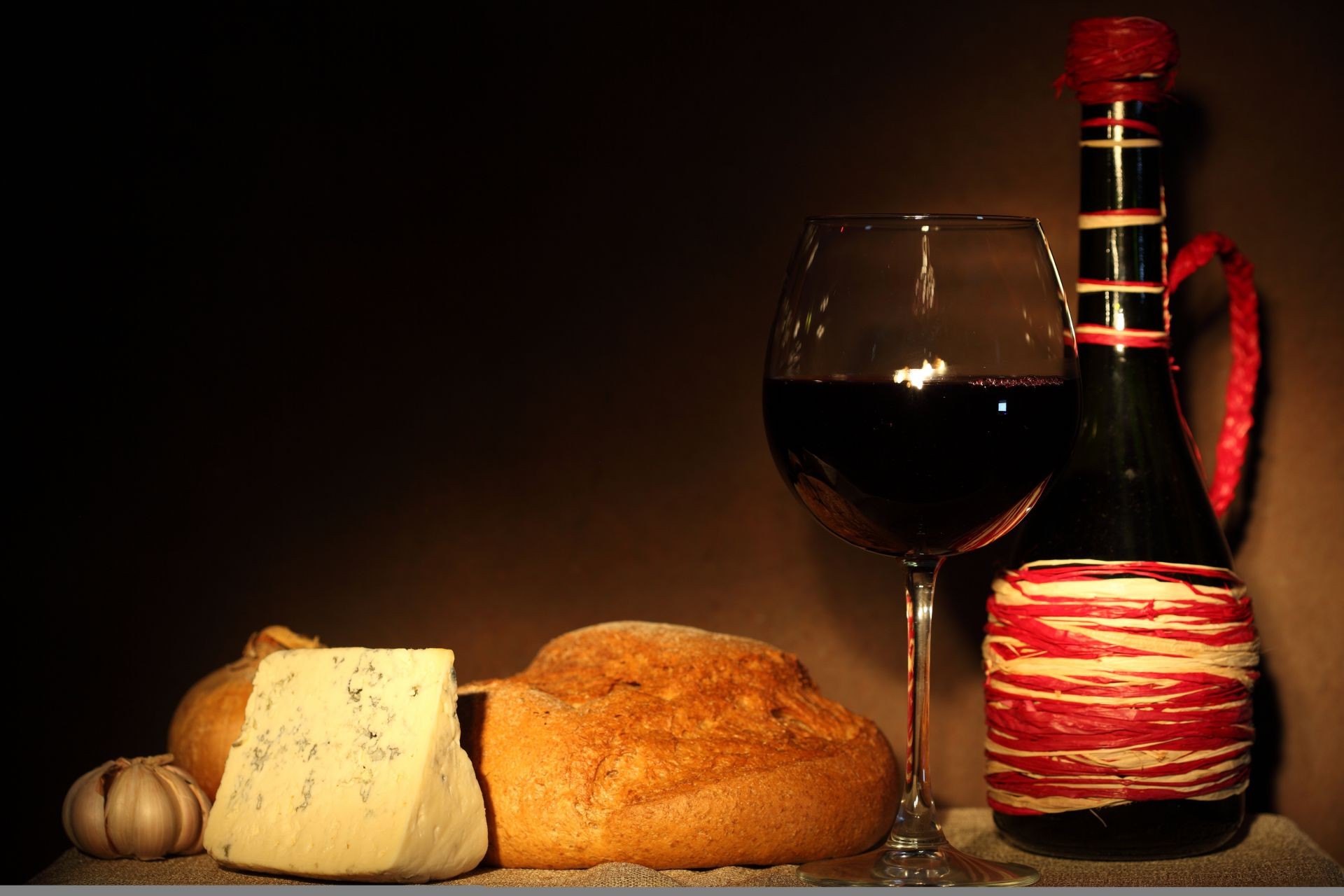 Brocca, bicchiere di vino rosso, formaggio blu, pane, aglio