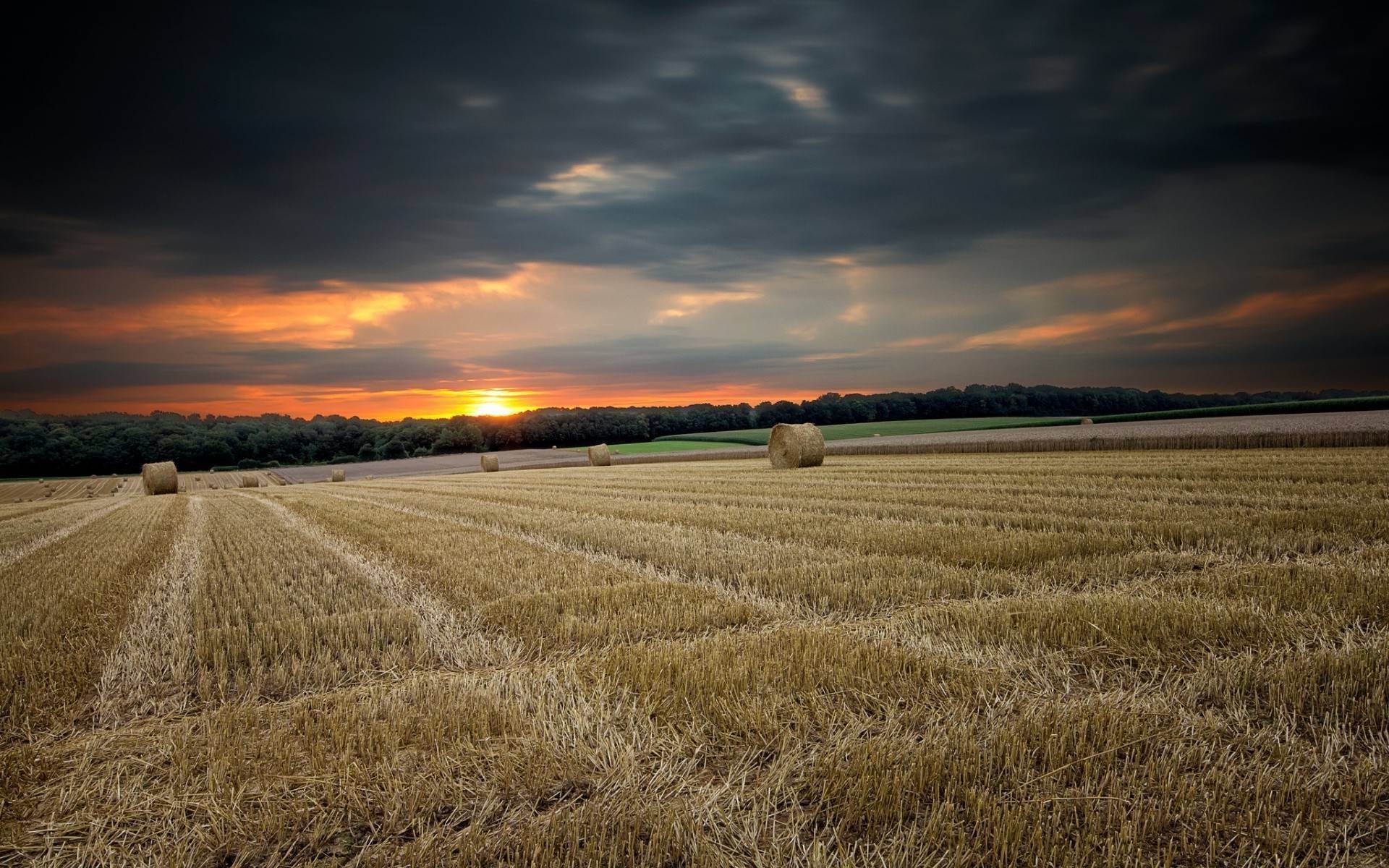Campo con erba falciata raccolti in balle al tramonto