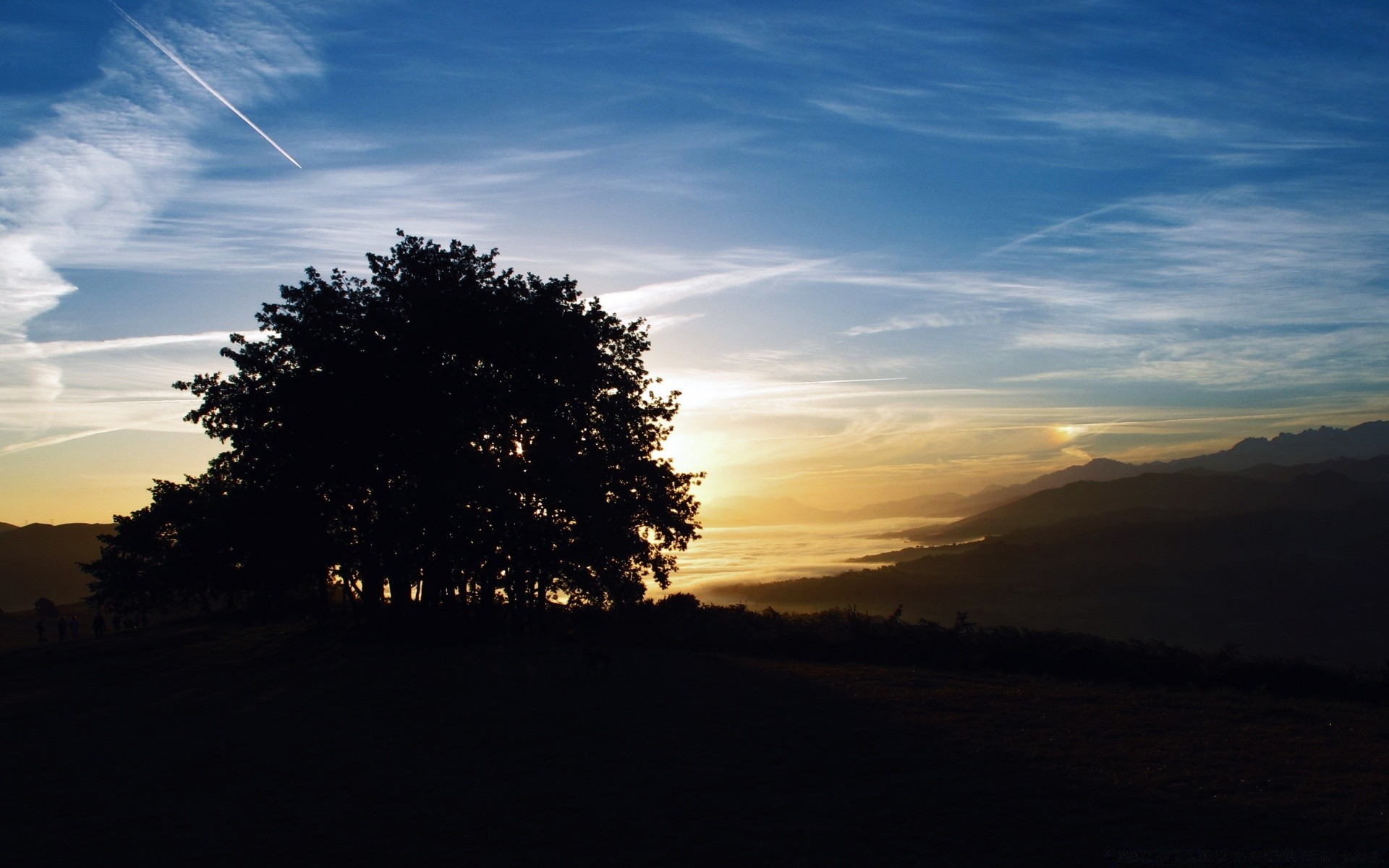 Alberi sullo sfondo del cielo blu ai raggi del sole dell'alba