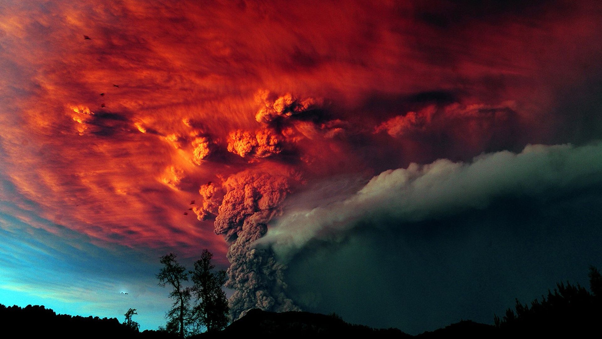 Vulcano eruzione alberi cenere cielo rosso