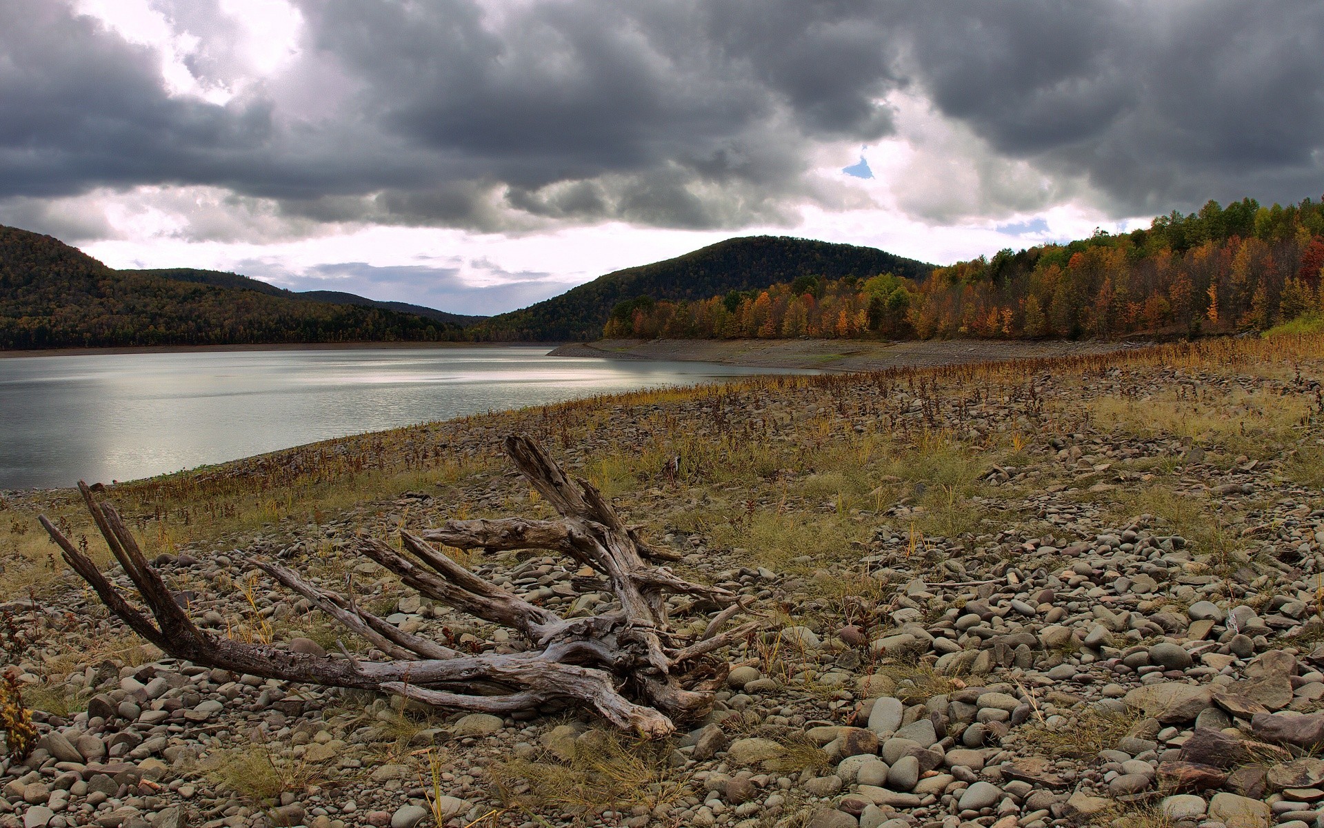 Lago con tempo nuvoloso. paesaggio del lago e degli alberi