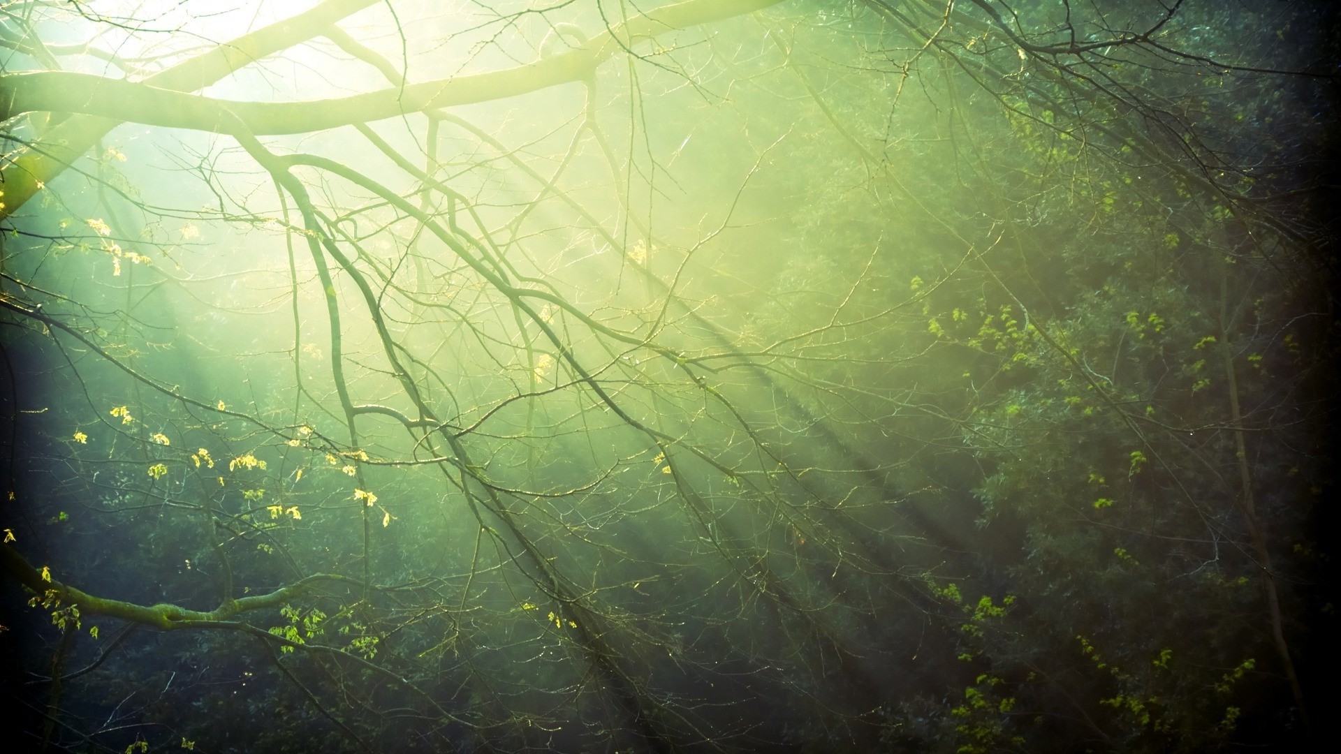 Raggi di sole all'alba attraverso i rami degli alberi