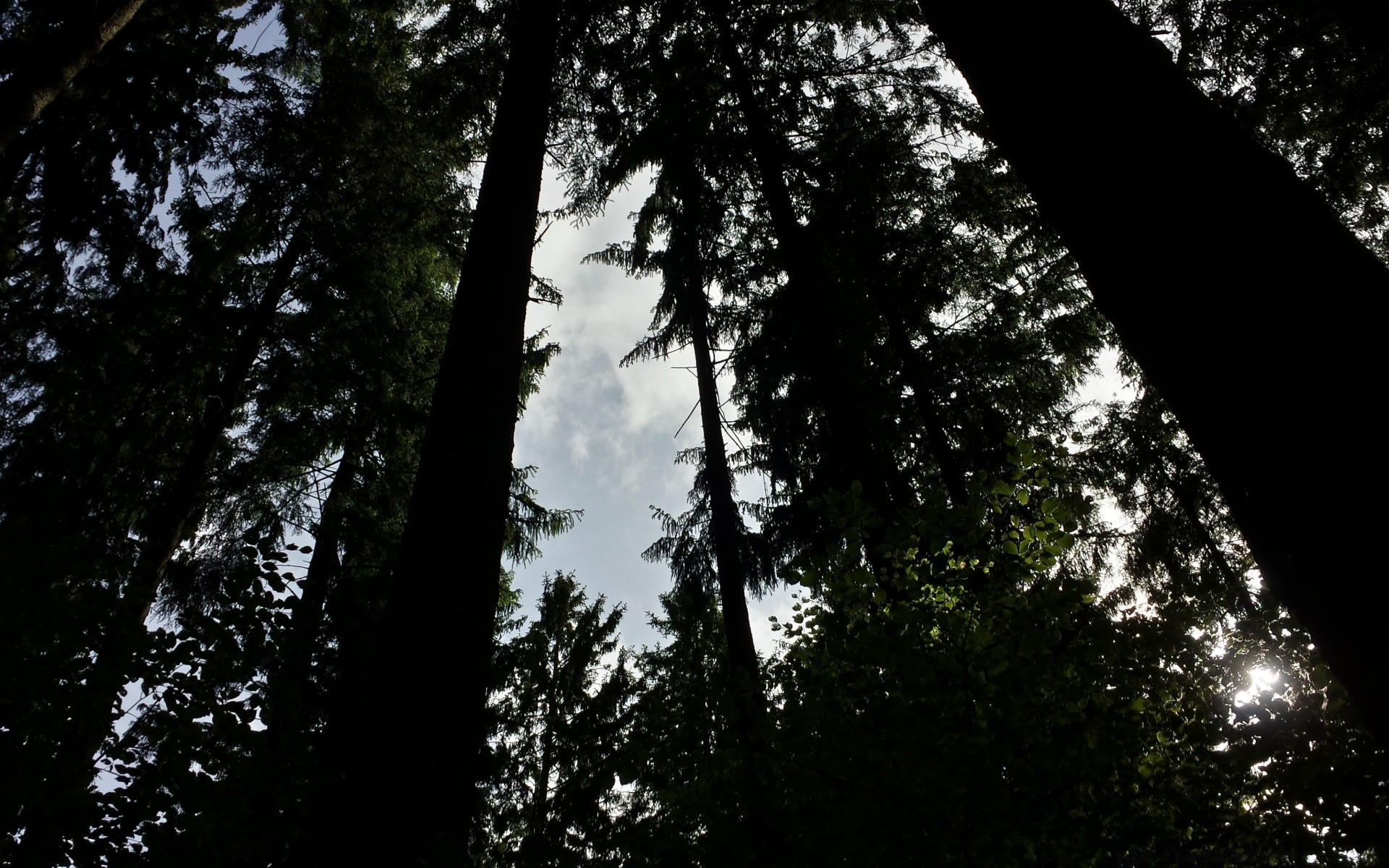 Paesaggio di montagne densamente popolato da alberi intorno acqua