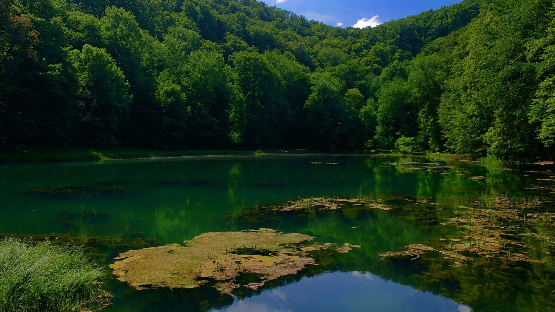 Occhio blu del Lago incorniciato da alberi come ciglia