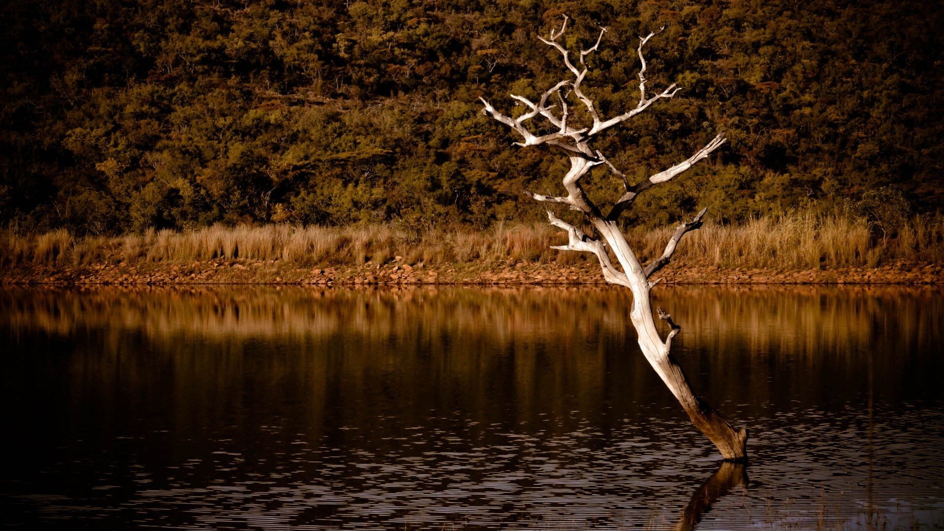 Albero solitario vicino al lago tra le montagne sullo sfondo del tramonto