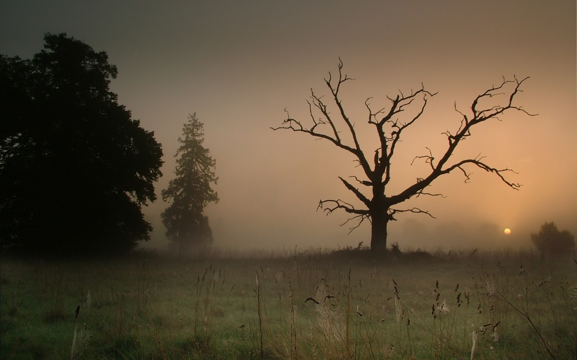 Tramonto, nebbia e e l'albero come simbolo di addio